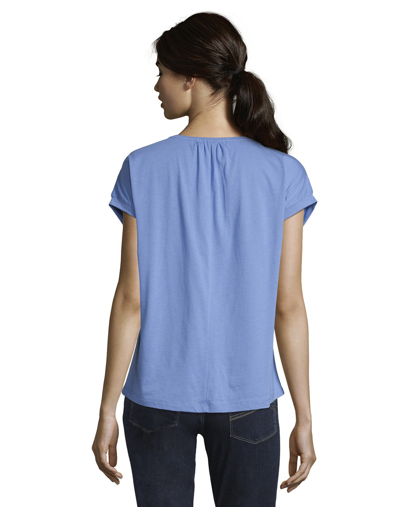 Топ свободного покроя. Кружевная кокетка на передней части изделия переходит в короткие рукава. Материал из смеси модала и хлопка приятен к телу и обеспечивает комфорт. Эта модель создает легкий и романтичный образ даже в брючном комплекте.