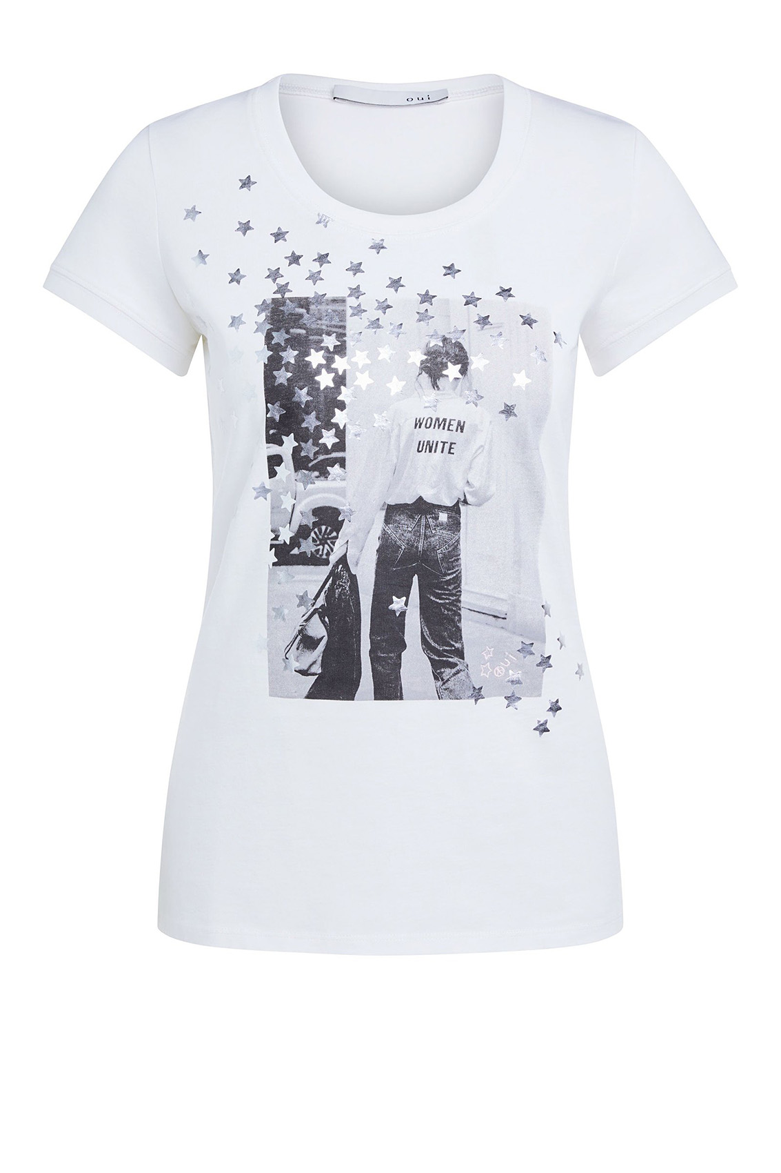 Стильная футболка полуприталенного силуэта. Круглый вырез горловины, короткие втачные рукава, принт с металлизированными элементами в виде звезд. Приятный к телу хлопковый материал обеспечивает комфорт.