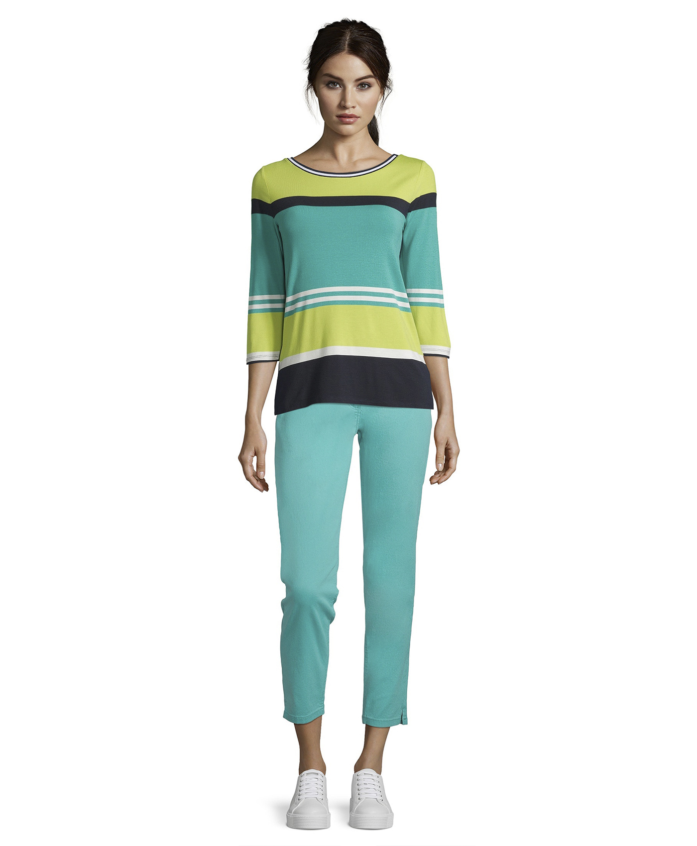 Футболка-лонгслив в полоску. Прямой покрой, вырез горловины "лодочка", рукава 3/4. Материал из вискозной смеси приятен к телу и обеспечивает комфорт. Эта футболка великолепно смотрится с любым однотонным вариантом низа, будь то брюки или юбка.