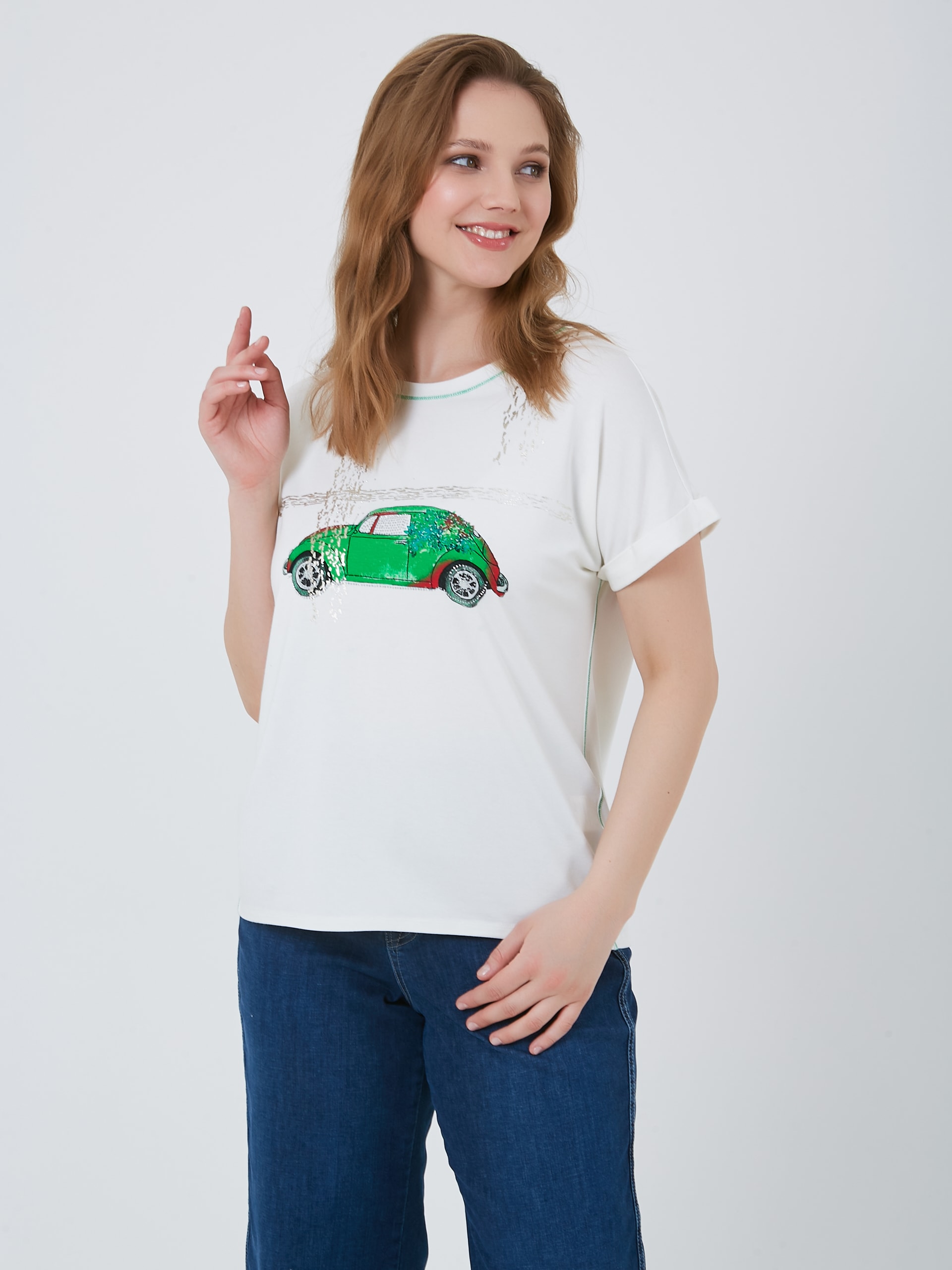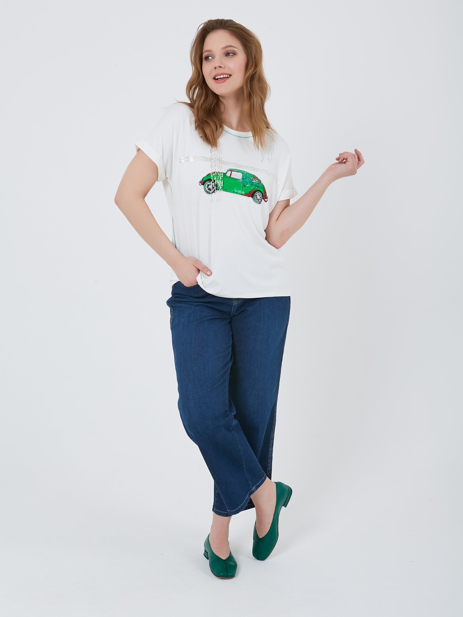 Футболка с изображением автомобиля с растительными мотивами и контрастной зеленой строчкой по бокам и на горловине. Весна-Лето 2025. Капсула "Марракеш". Параметры модели: 95-64-101, рост 175, размер 44-46
