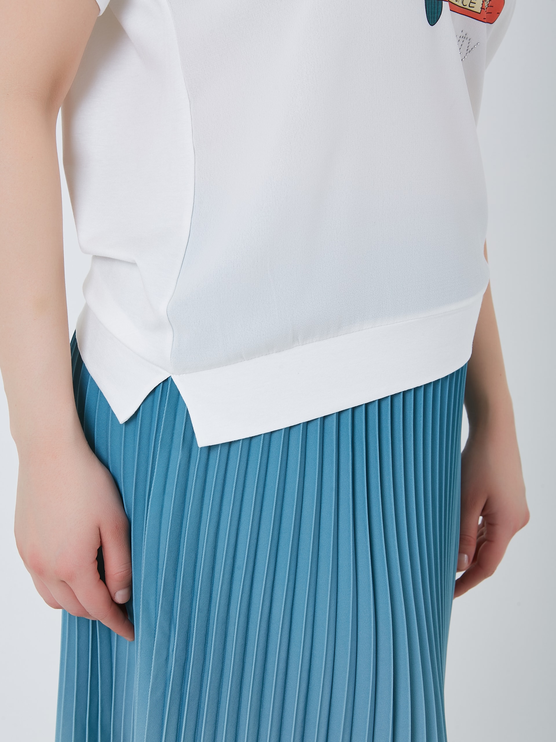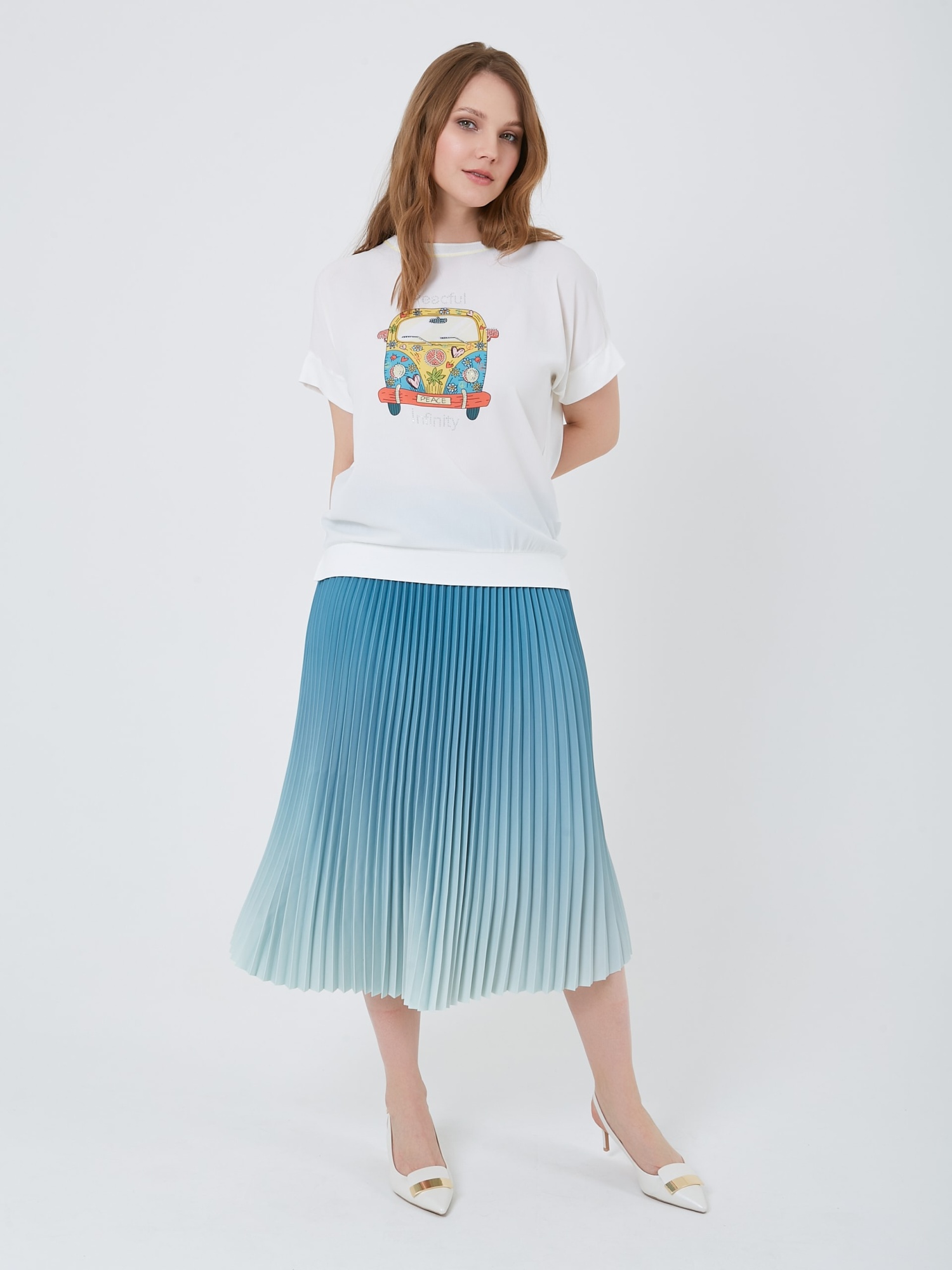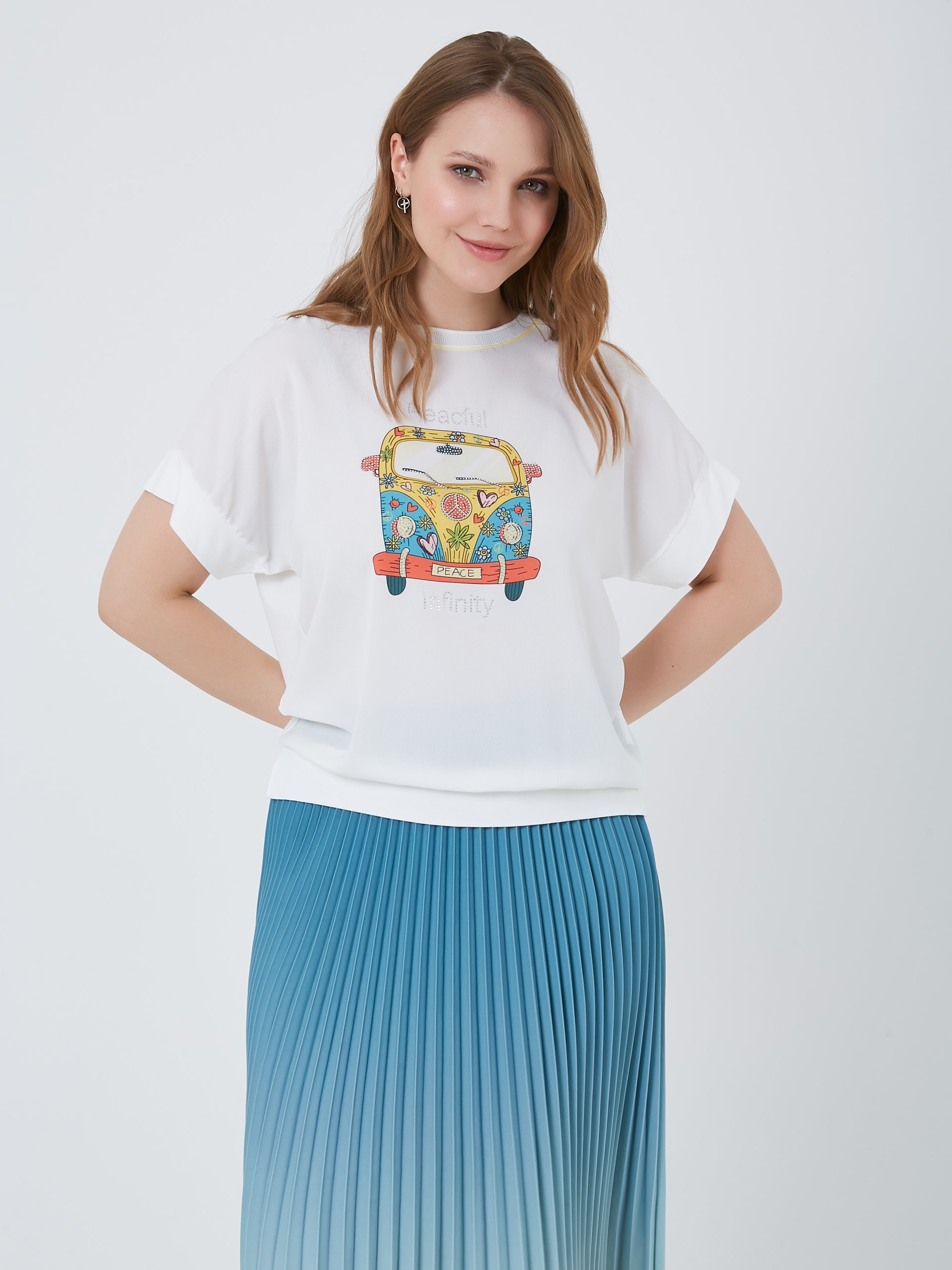 Базовая модель футболки с принтом цветочного авто с буквой S и выточками по бокам. Весна-Лето 2025. Капсула "Санторини". Параметры модели: 95-64-101, рост 175, размер 44-46