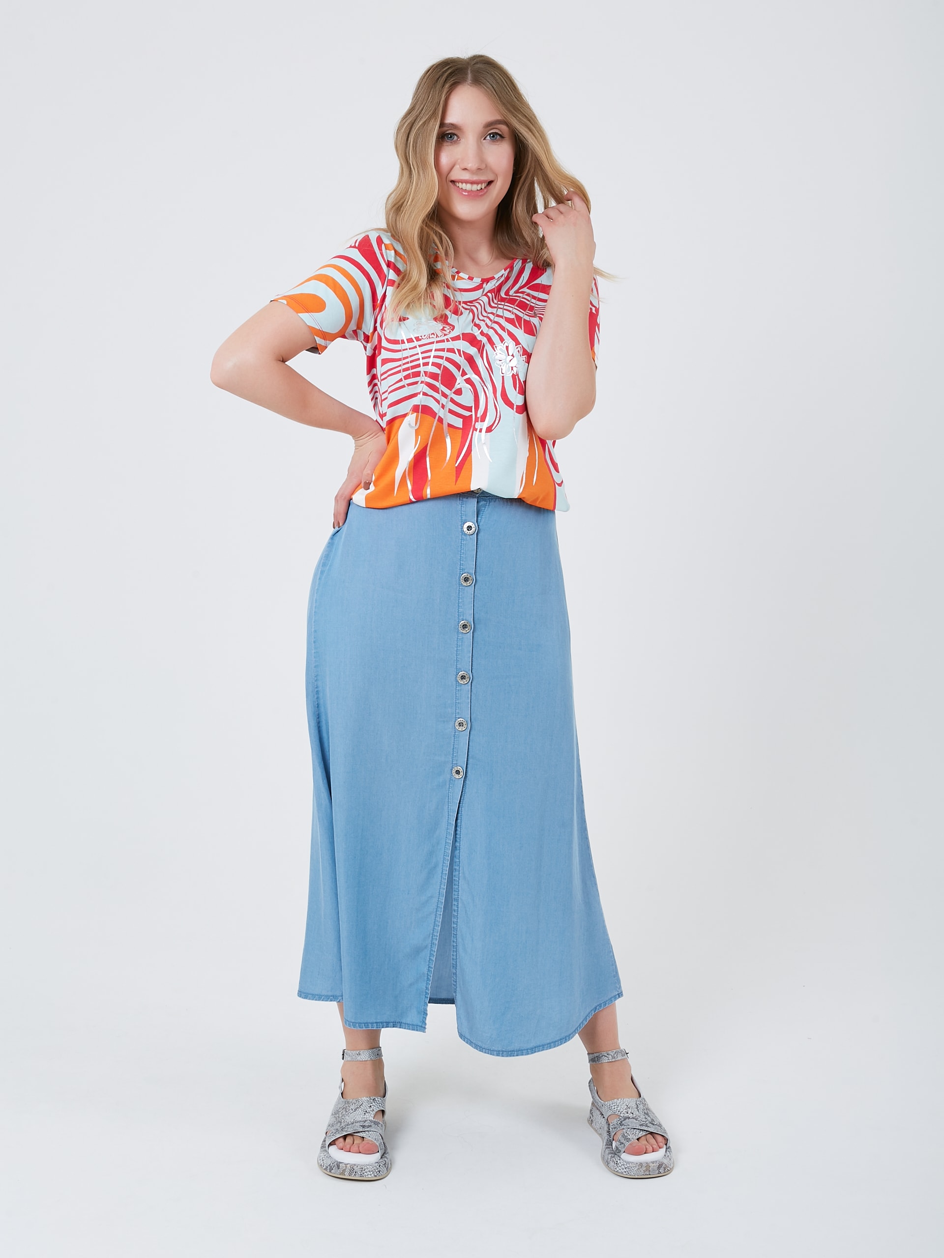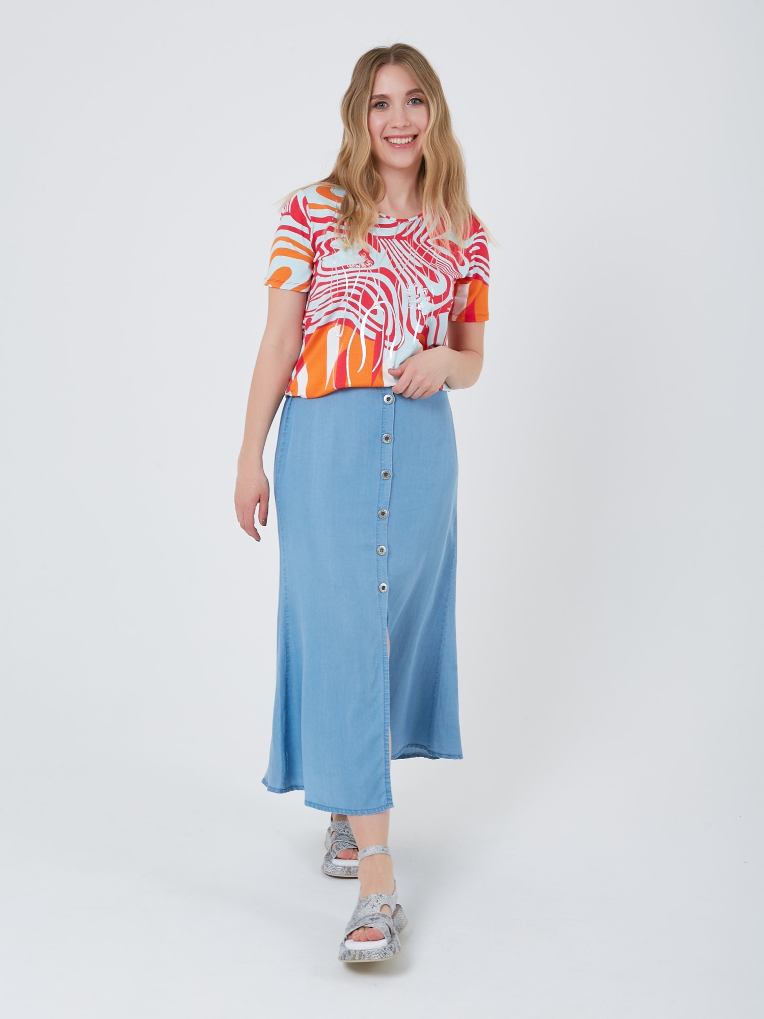 Футболка с ярким абстрактным узором в красных и оранжевых тонах, прекрасно дополнит летний образ и добавит яркости в гардероб. Весна-Лето 2025. Капсула "Санторини". Параметры модели: 89-70-92, рост 167, размер 44-46