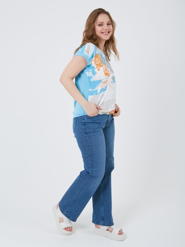 Футболка с резинкой по низу, украшена ярким принтом в нежных голубых и оранжевых тонах. Весна-Лето 2025. Капсула "Санторини". Параметры модели: 95-64-101, рост 175, размер 44-46