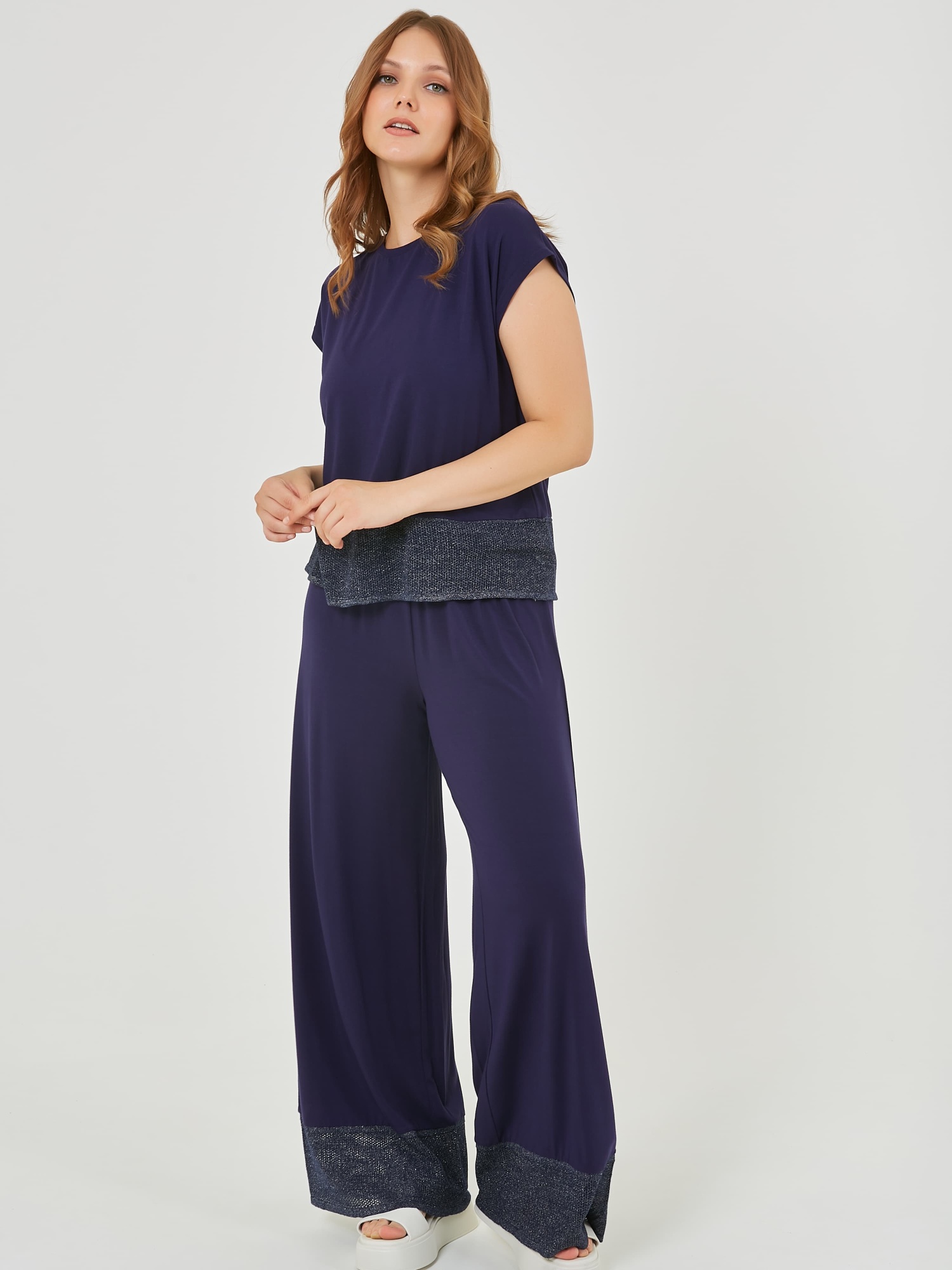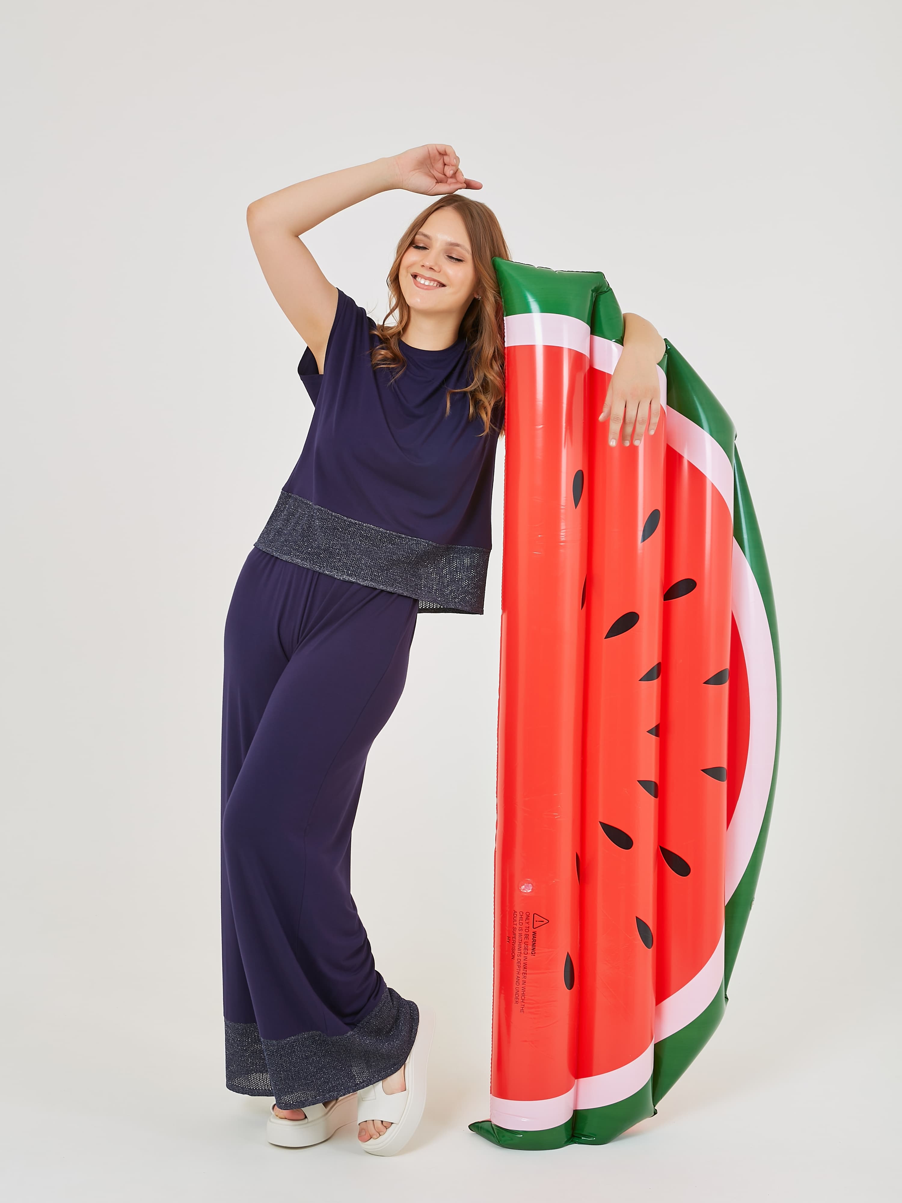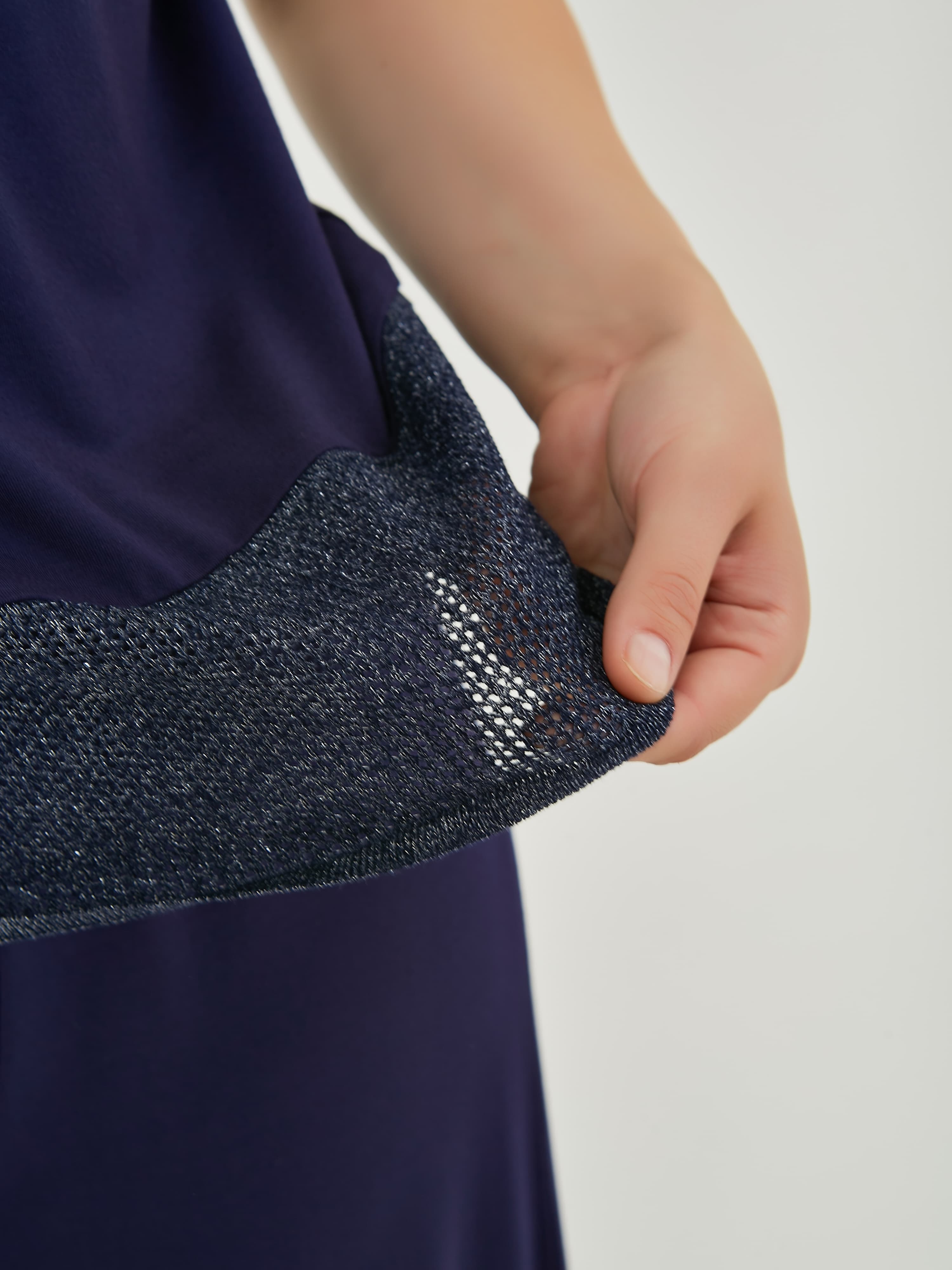 Стильная футболка глубокого синего цвета с короткими рукавами и текстурированным низом идеально сочетает комфорт и современный дизайн. Коллекция Весна-Лето 2025. Капсула "Самарканд". Параметры модели: 95-64-101, рост 175, размер 44-46