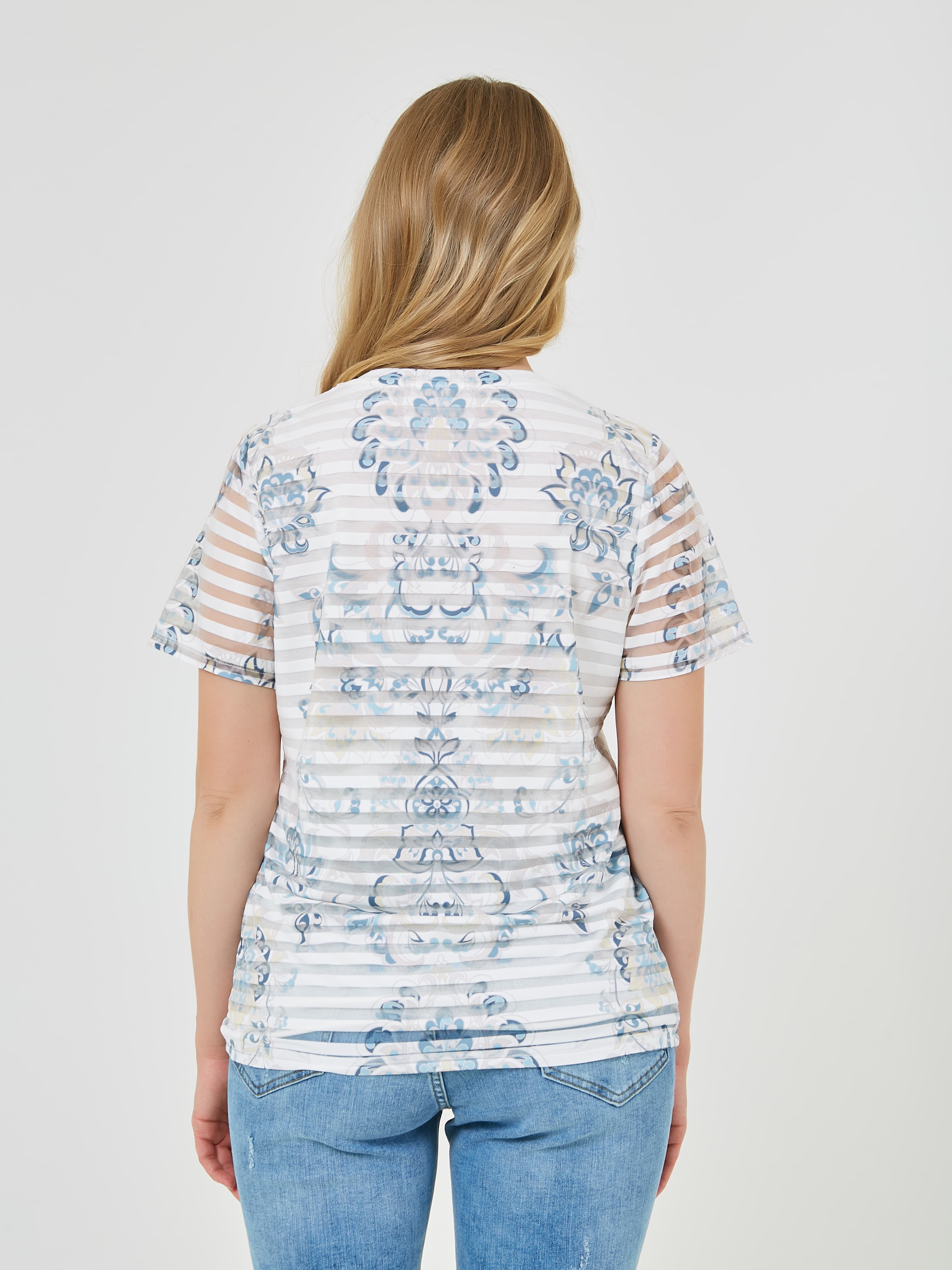 Футболка с короткими рукавами, сочетает белый цвет с голубыми и синими узорами, а полосатые рукава и цветочный принт добавляют уникальности. Коллекция Весна-Лето 2025. Капсула "Санторини". Параметры модели: 89-70-92, рост 167, размер 44-46