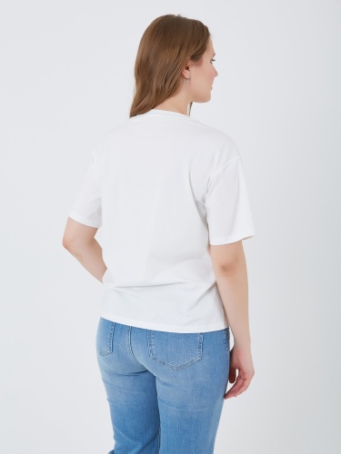 Футболка выполнена в белом цвете и украшена ярким принтом с изображением лимона. Модель имеет классический крой с круглым вырезом, что делает её подходящей для повседневной носки. Коллекция Весна-Лето 2025. Капсула "Рио де Жанейро". Параметры модели: 95-64-101, рост 175, размер 44-46