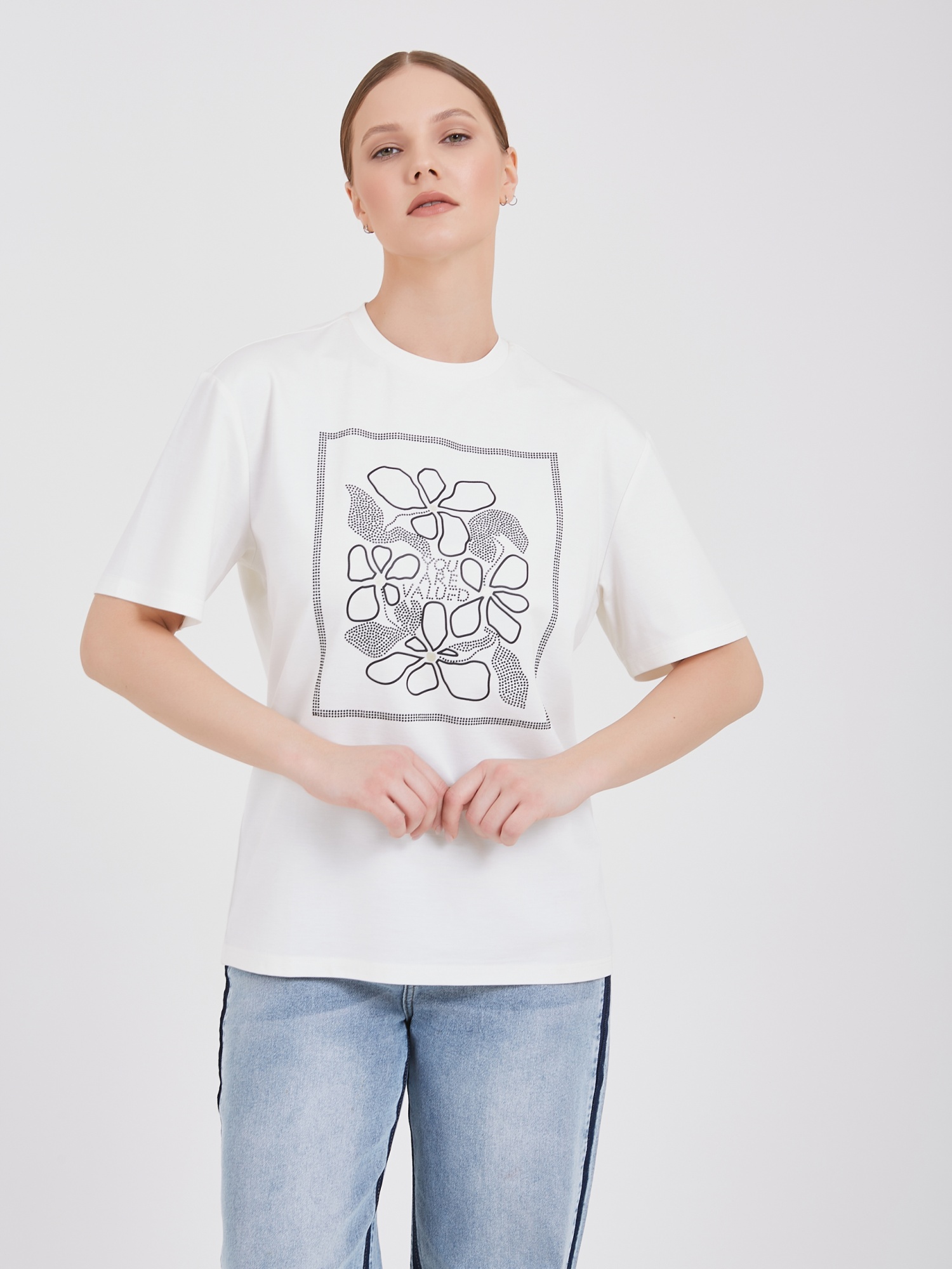 Футболка обладает классическим втачным рукавом и выполнена из более плотного трикотажа, чем летние варианты. Благородный чернильно-чёрный оттенок выгодно подчёркивает оригинальную аппликацию из золотых страз, придавая изделию дороговизну и шик. Футболка подойдёт женщинам разных фигур, идеально вписываясь в городской стиль и позволяя создать стильный и утончённый образ.