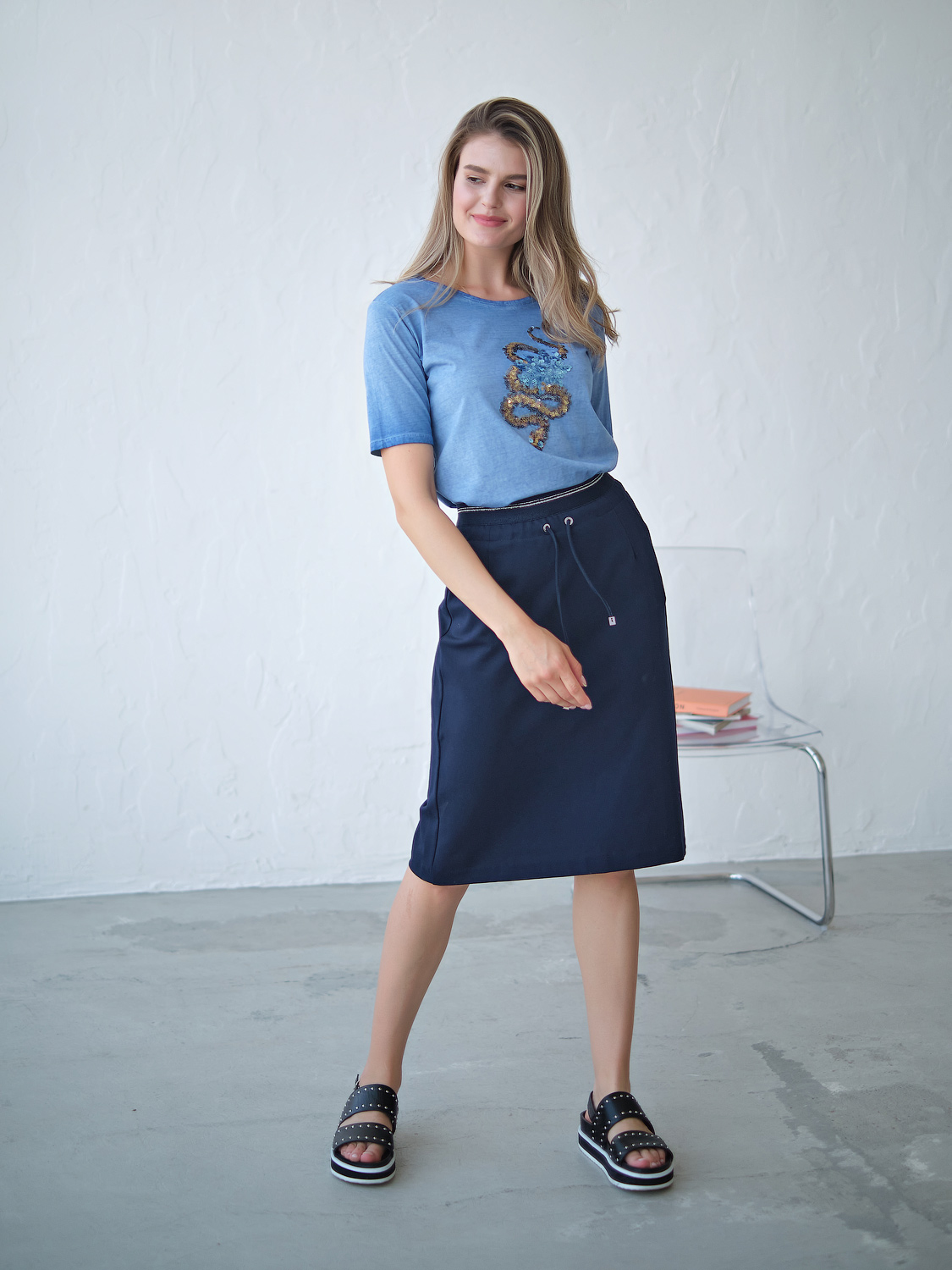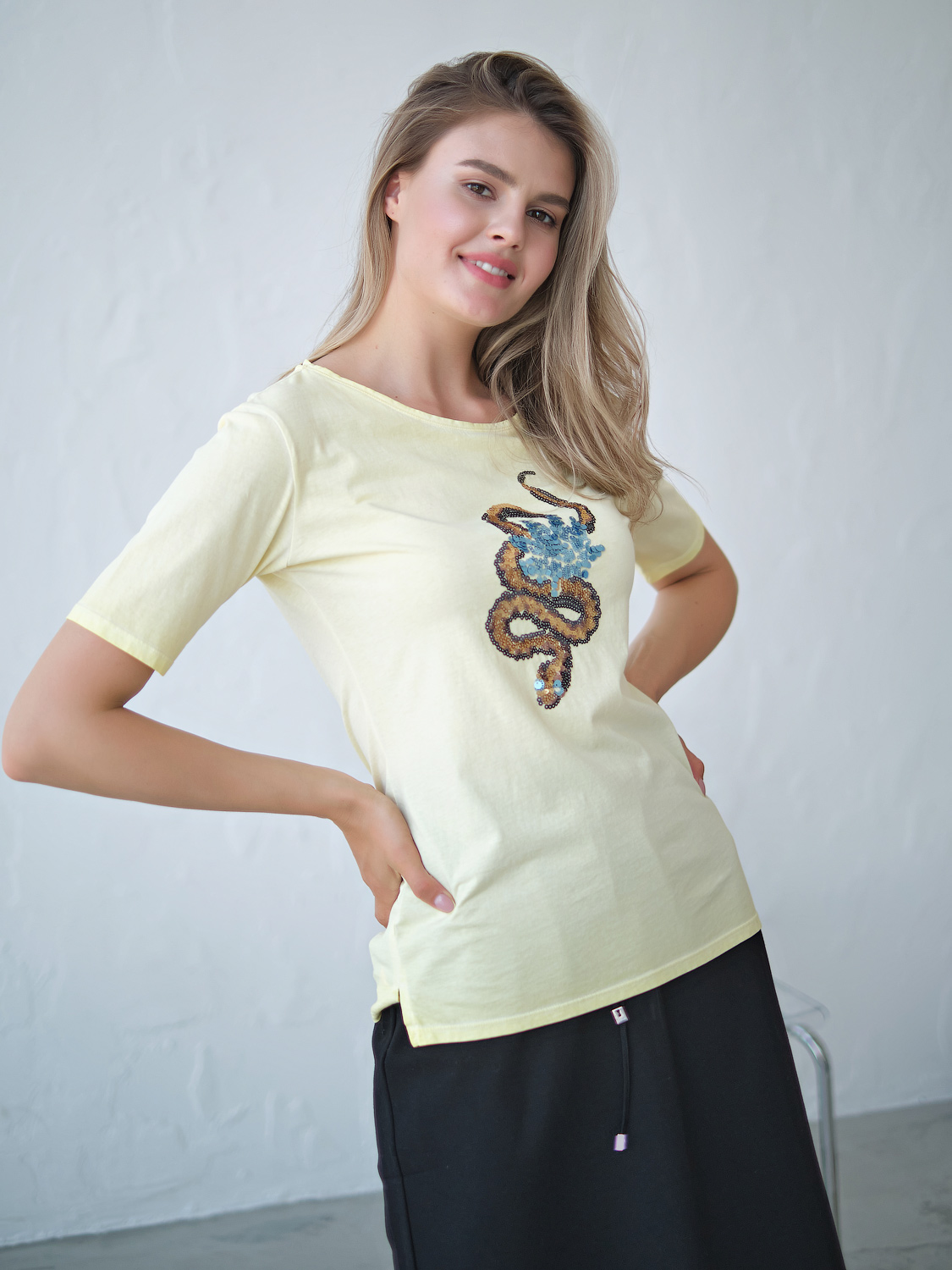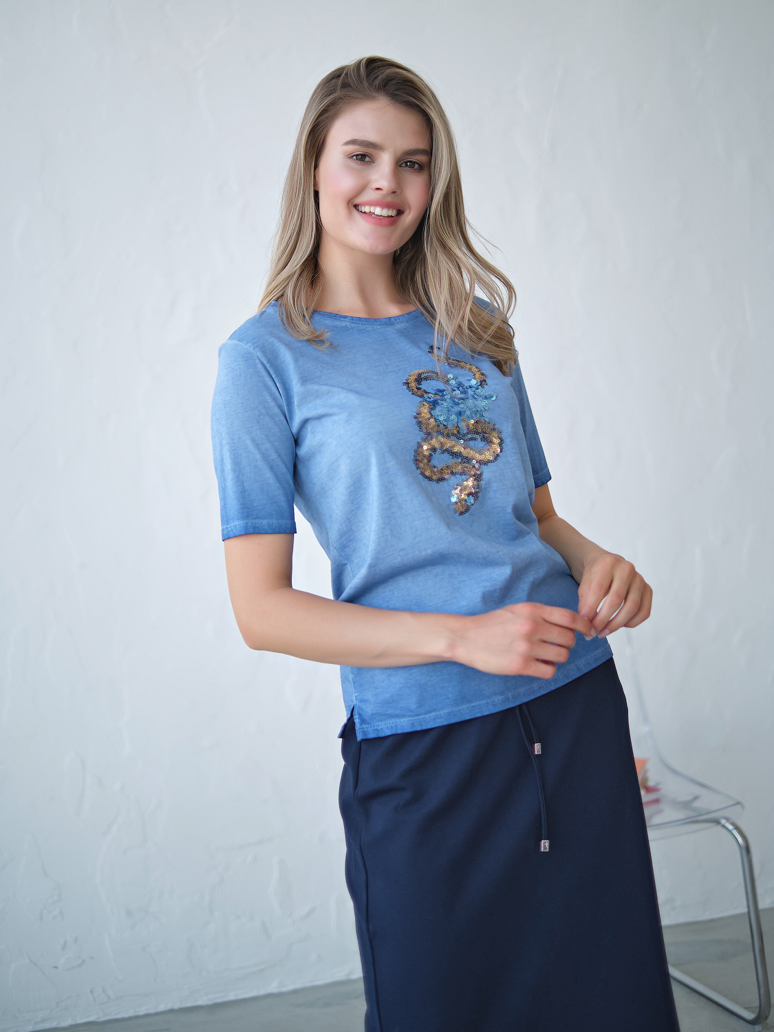 Ткань из натуральных материалов обеспечит комфорт и прохладу жарким летом. Прямой покрой скроет недостатки фигуры. Круглый вырез горловины создает женственный образ. Футболка украшена вышивкой из пайеток. Данная модель будет хорошо сочетаться с брючным комплектом.