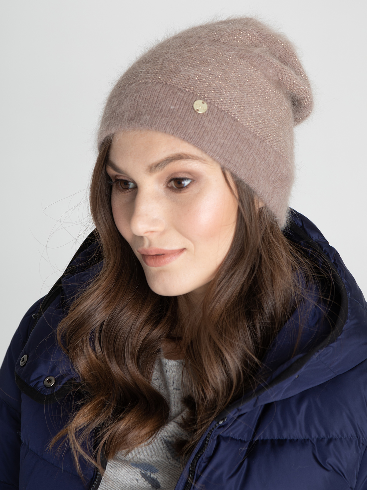 Однотонная шапочка-бини из ангоры с добавлением смесовой шерсти. Нить люрекса обеспечивает приятный блеск. Шапка хорошо сохраняет тепло и подходит для любого овала лица.