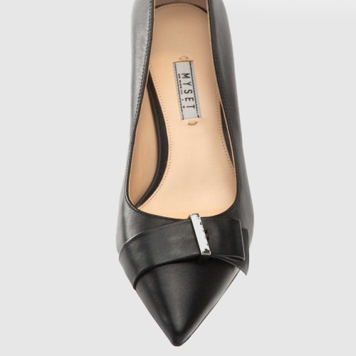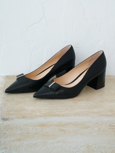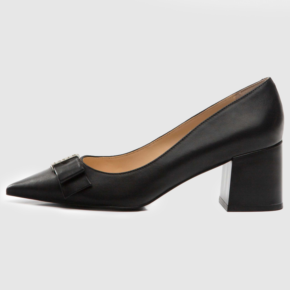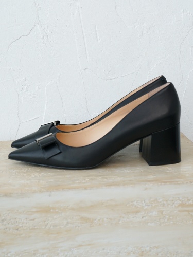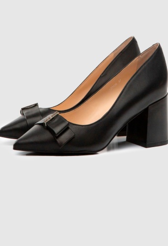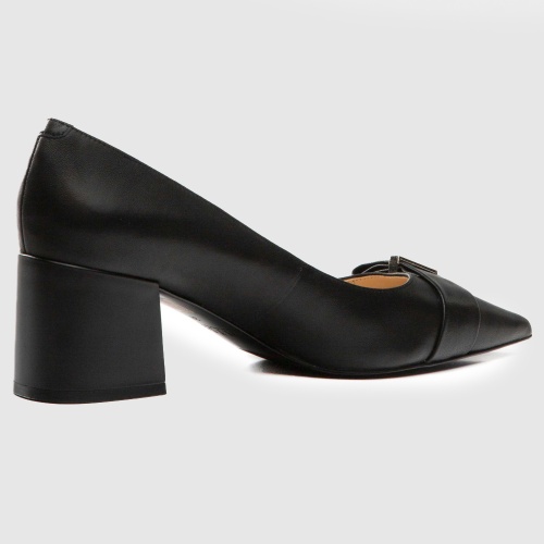 Черные туфли из натуральной кожи. Заостренные носы с декоративным ремешком. Широкий устойчивый каблук. Высота каблука: 6 см. Туфли подойдут для классического образа в деловом стиле или торжественного мероприятия.
