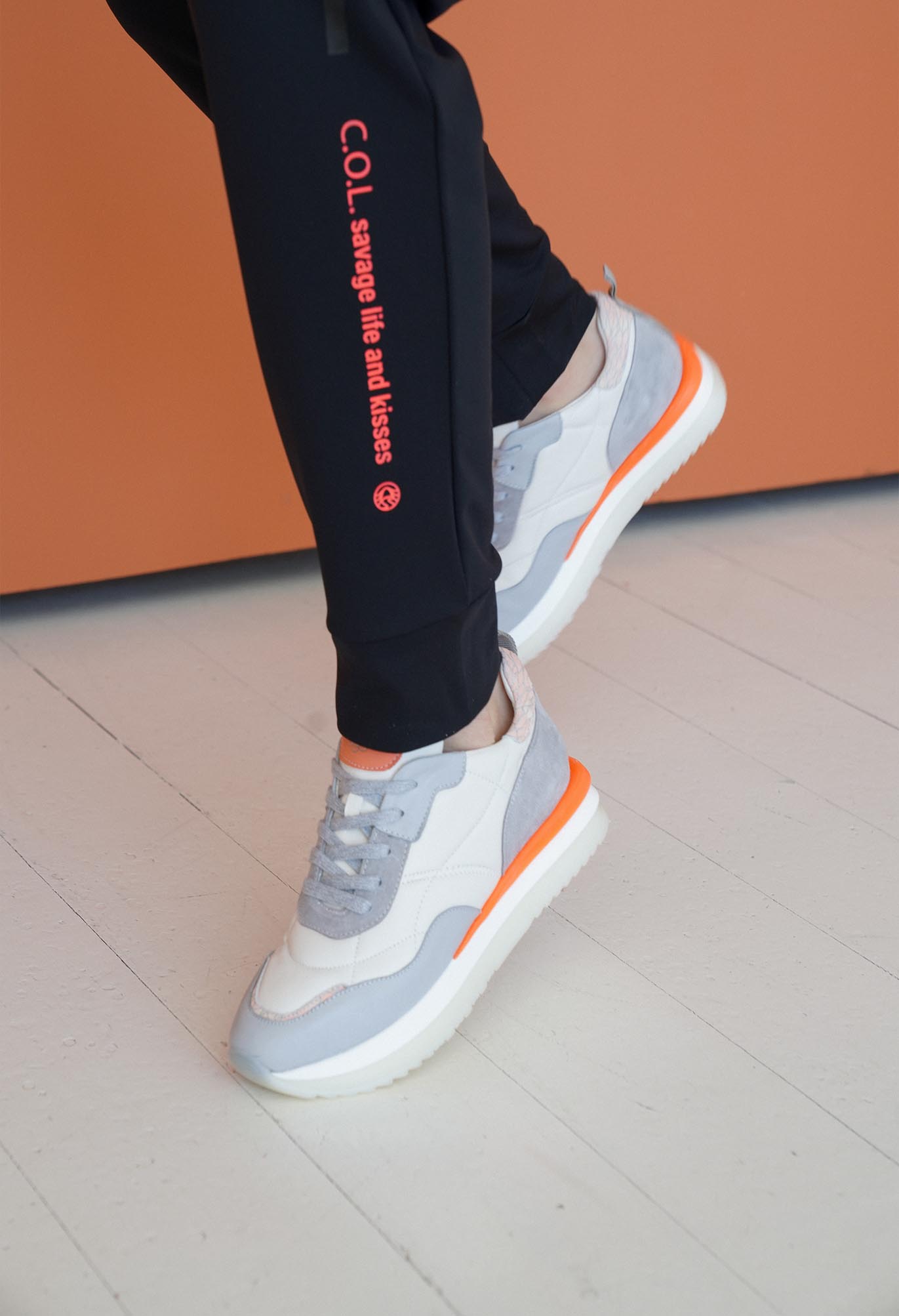 Серые кроссовки TUFFONI из натуральной кожи с яркими оранжевыми акцентами.