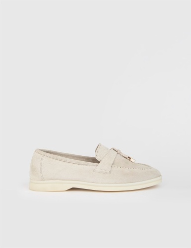 Бежевые замшевые кожаные женские лоферы. Изготовлено из высококачественной телячьей кожи. Bысота подошвы: 2,5 см. Резиновая подошва. Ручная работа.