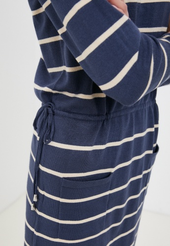 На сайте указаны Российские размеры. Платье длины миди в полоску станет частью повседневного городского образа. Материал из смеси вискозы и нейлона приятен к телу и обеспечивает комфортное ношение. Кулиска на талии. Овальный вырез горловины. Втачной рукав полной длины.