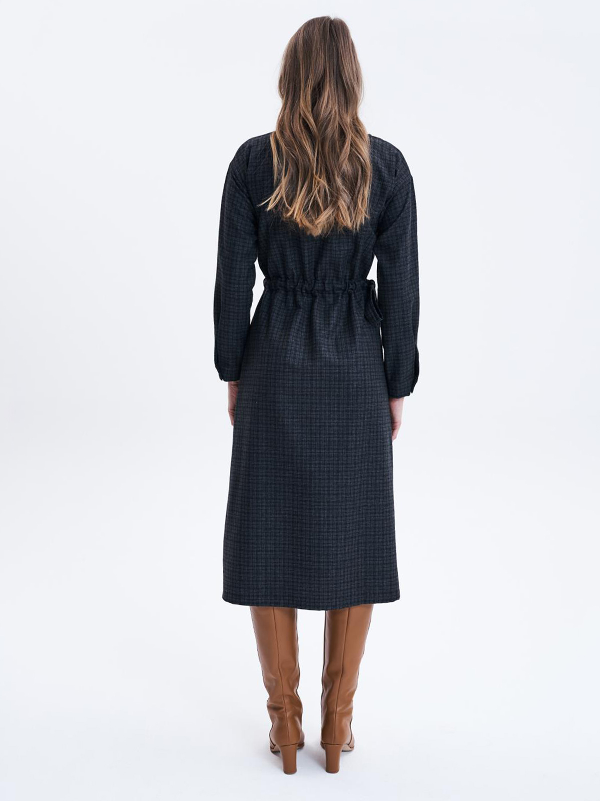 Платье длины миди для создания образа в деловом стиле. Кулиска на поясе, втачной рукав полной длины, овальный вырез горловины.