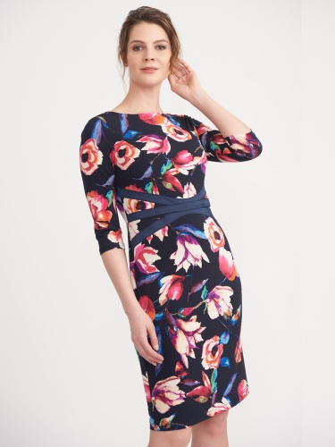 Платье миди с цветочным узором по всей поверхности изделия. Приталенный силуэт, длина до колена. Овальная горловина, V-образный вырез на спинке, втачной рукав 3/4.
