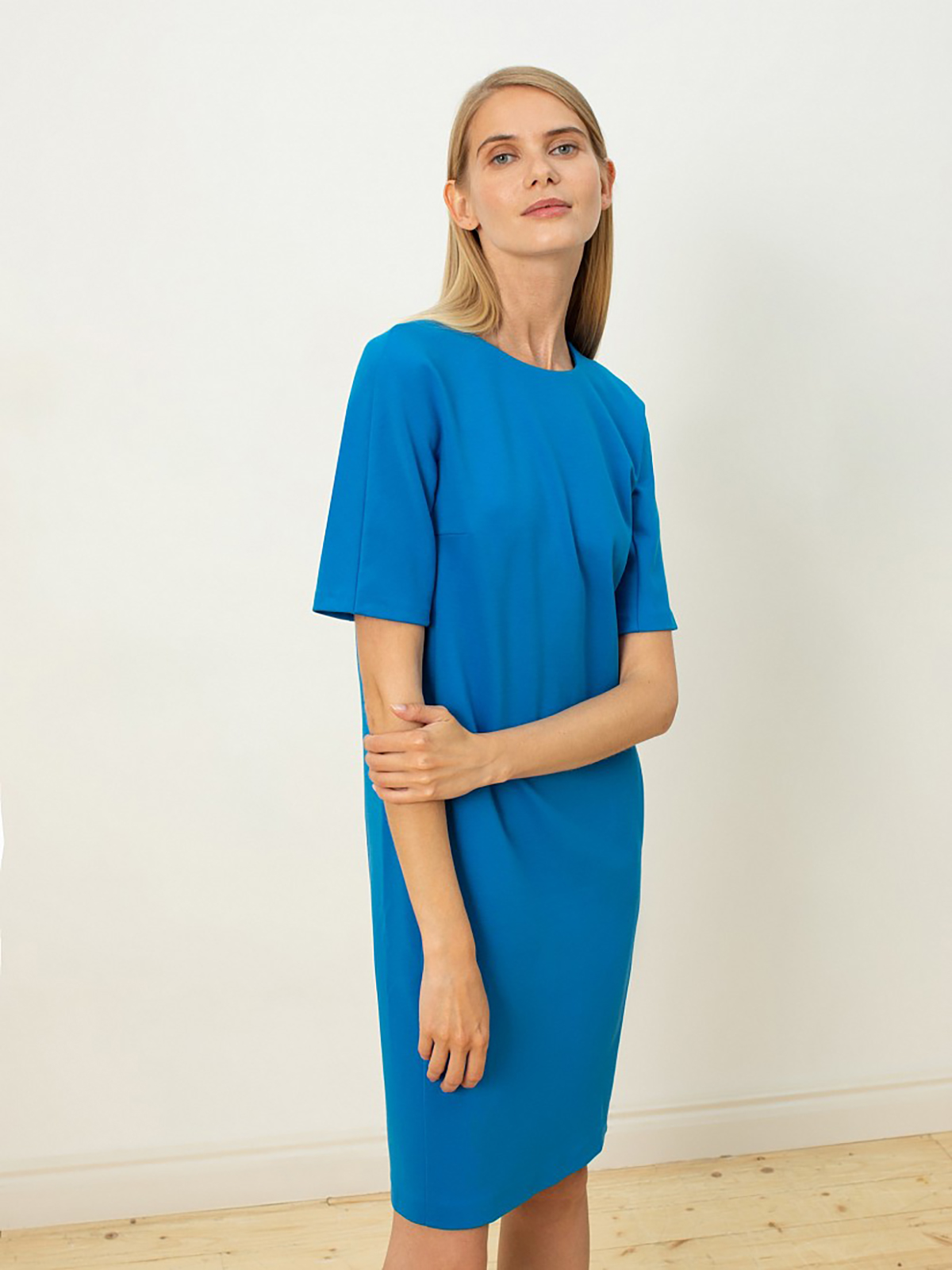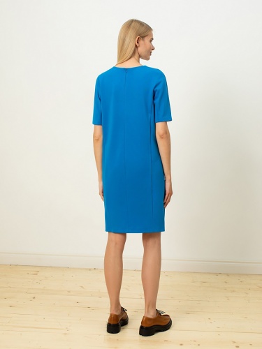 Однотонное платье прямого кроя с круглой горловиной, коротким рукавом кимоно и рельефами на спинке и переде.