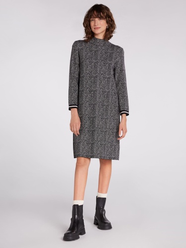 Платье прямого кроя с узором в елочку по всей поверхности изделия. Воротник стойка, длинные втачные рукава с контрастными манжетами.