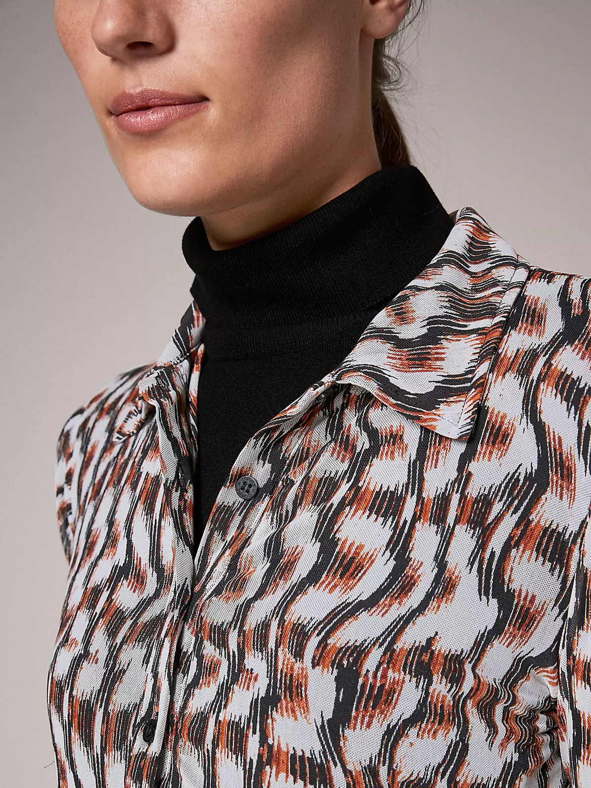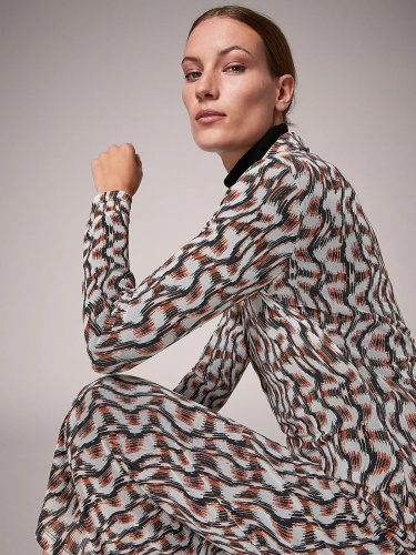 Платье миди длины с абстрактным геометрическим узором по всей поверхности изделия. Полуприталенный силуэт. Отложной рубашечный воротник, планка с пуговицами. Длинный втачной рукав. Платье подойдет для образов в повседневном городском стиле.