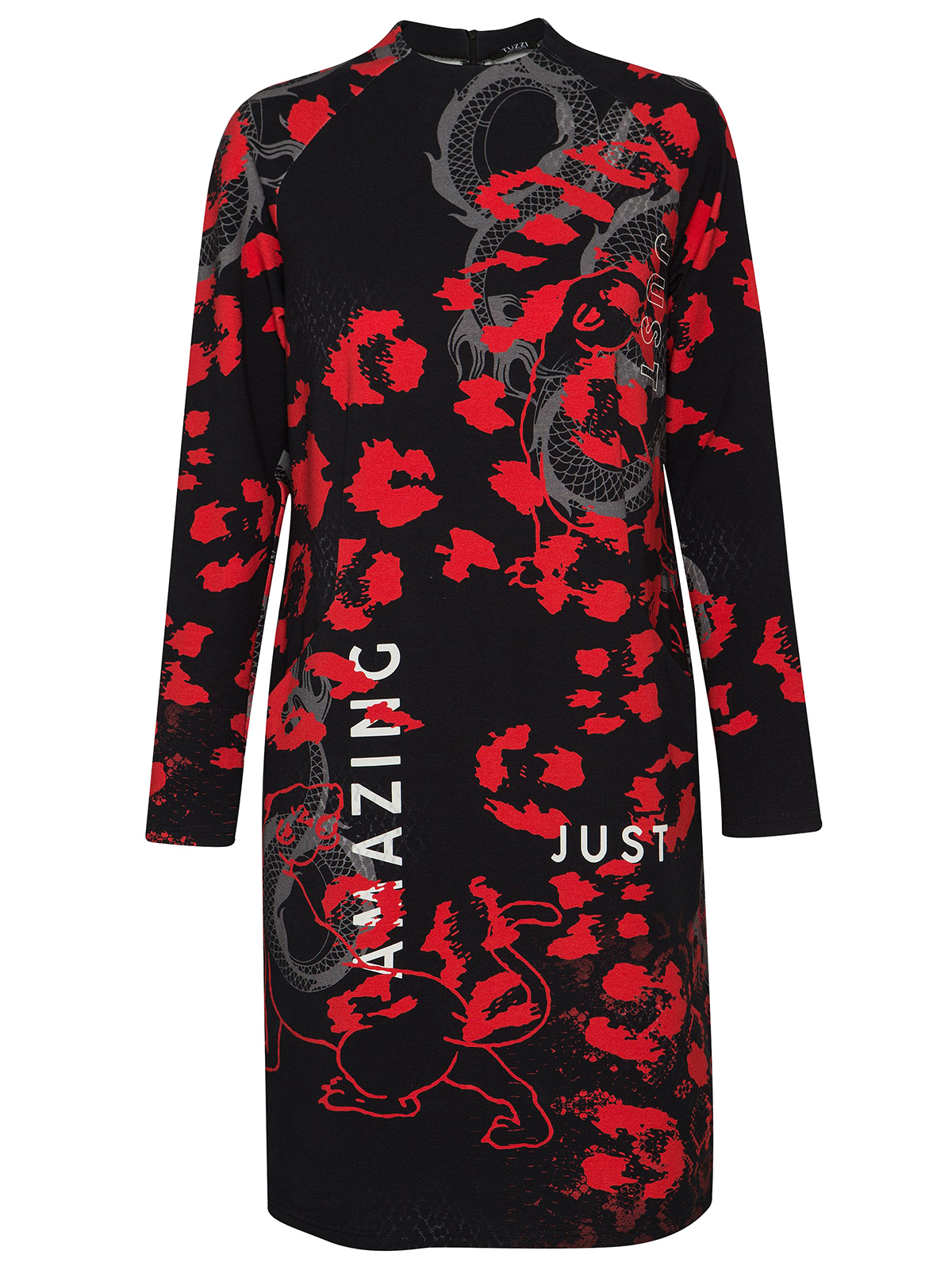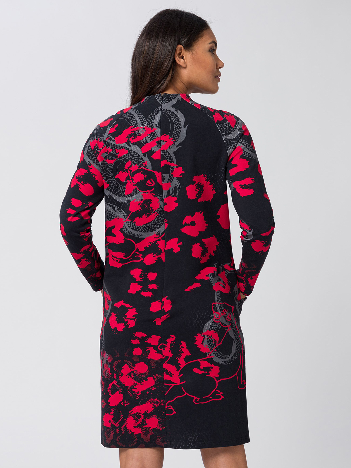 Платье прямого кроя с красным леопардовым принтом со сдержанными животными мотивами красиво прилегает к телу. Воротник-стойка, длинные втрачные рукава.