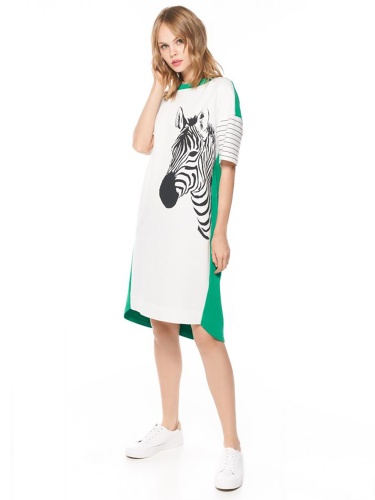 Бело-зеленое платье свободного силуэта с анималистичным принтом зебра. Втачной короткий рукав со спущенной линией плеч. Круглый вырез горловины обрамлен бейкой. Спинка изделия удлиненная, с закруглённым подолом.
