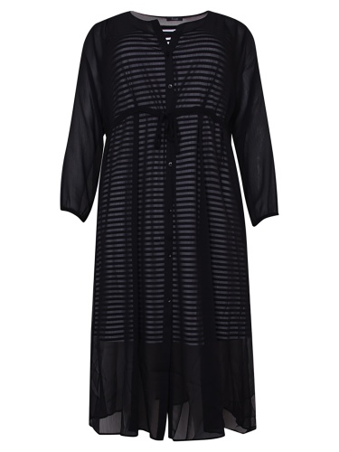 Двуслойное платье длины миди. Нижнее платье в черно-белую полоску, без рукавов, с широкими бретелями и глубоким овальным вырезом горловины. Верхнее платье из полупрозрачного шифона имеет втачной рукав полной длины и кулиску на поясе, застегивается на пуговицы.