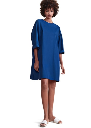 Это короткое платье создает собственный модный дресс-код: повседневный размер оверсайз, длинный рукав и круглый вырез. Платье из эластичного хлопкового поплина стрейч также можно комбинировать как тунику с облегающим приталенным кроем.