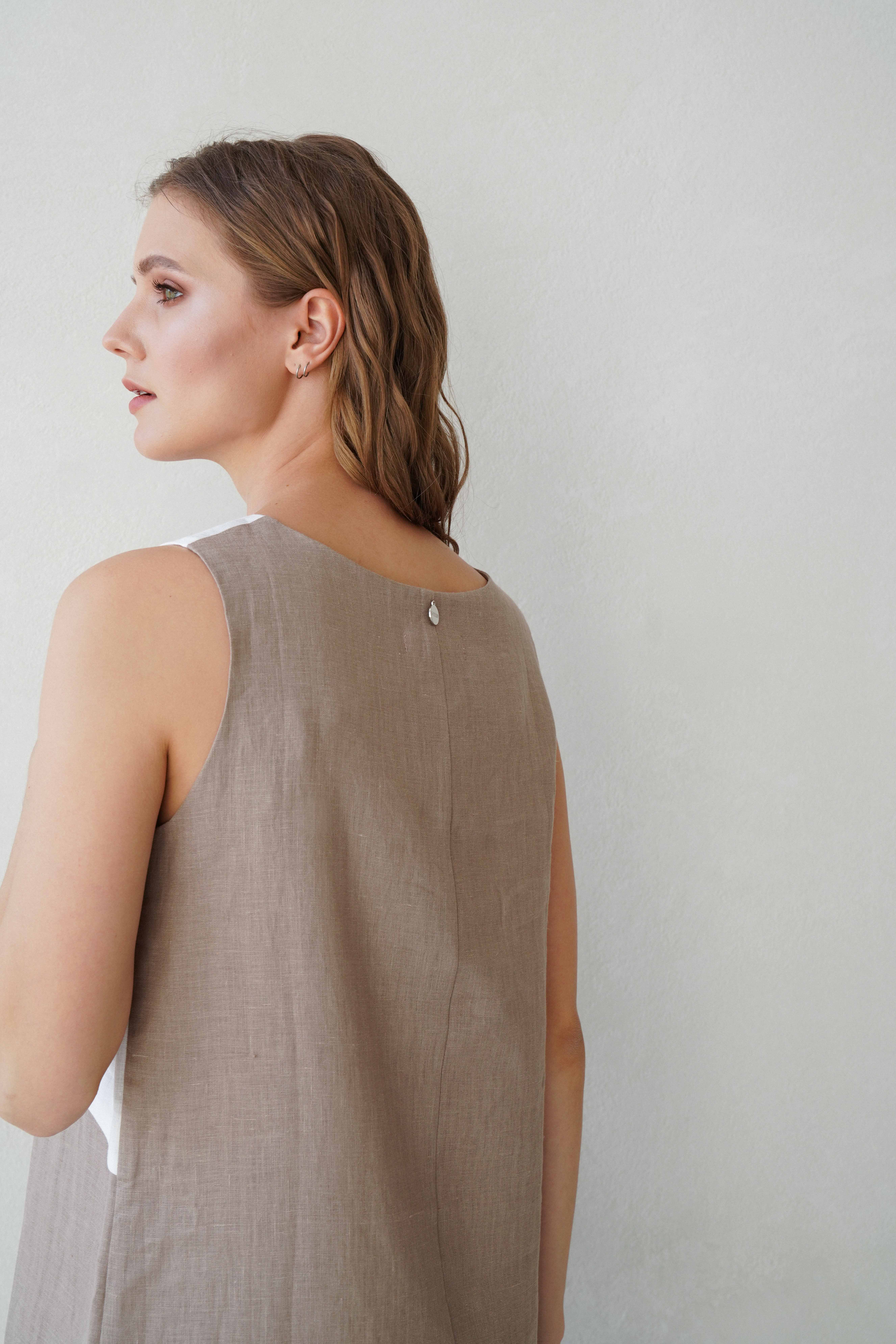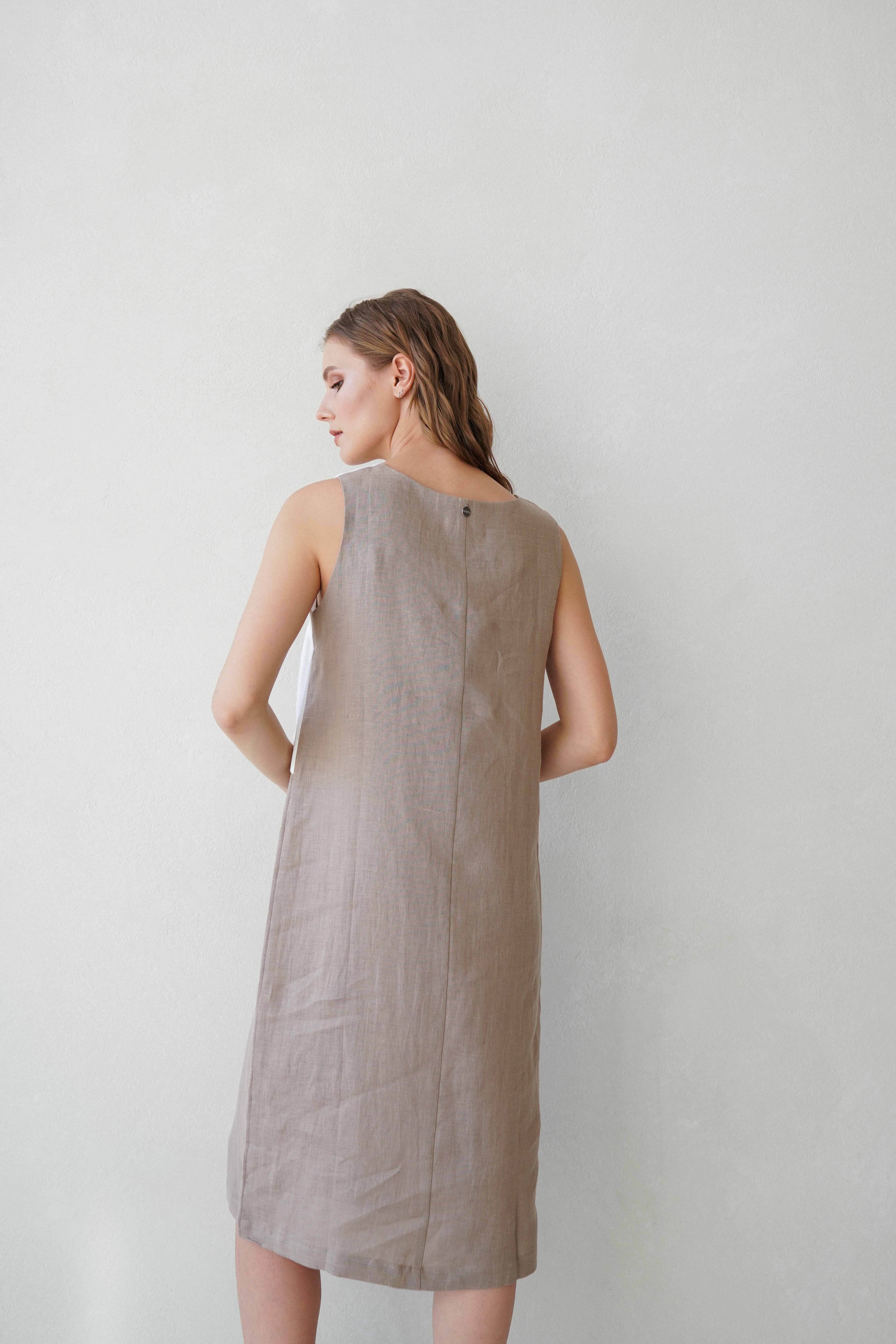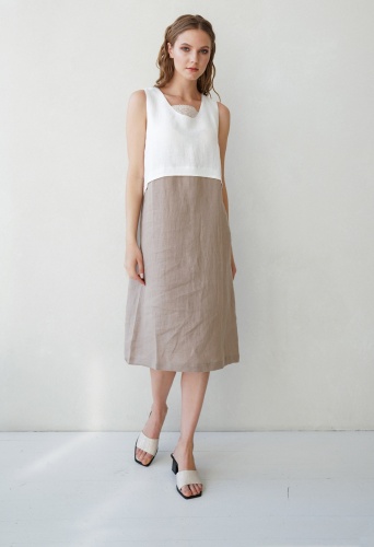 Льяное платье STERN ниже колена отлично подойдет для отдыха на жарких курортах. Модель украшена вязаным элементом на круглом вырезе и накладным фартуком.