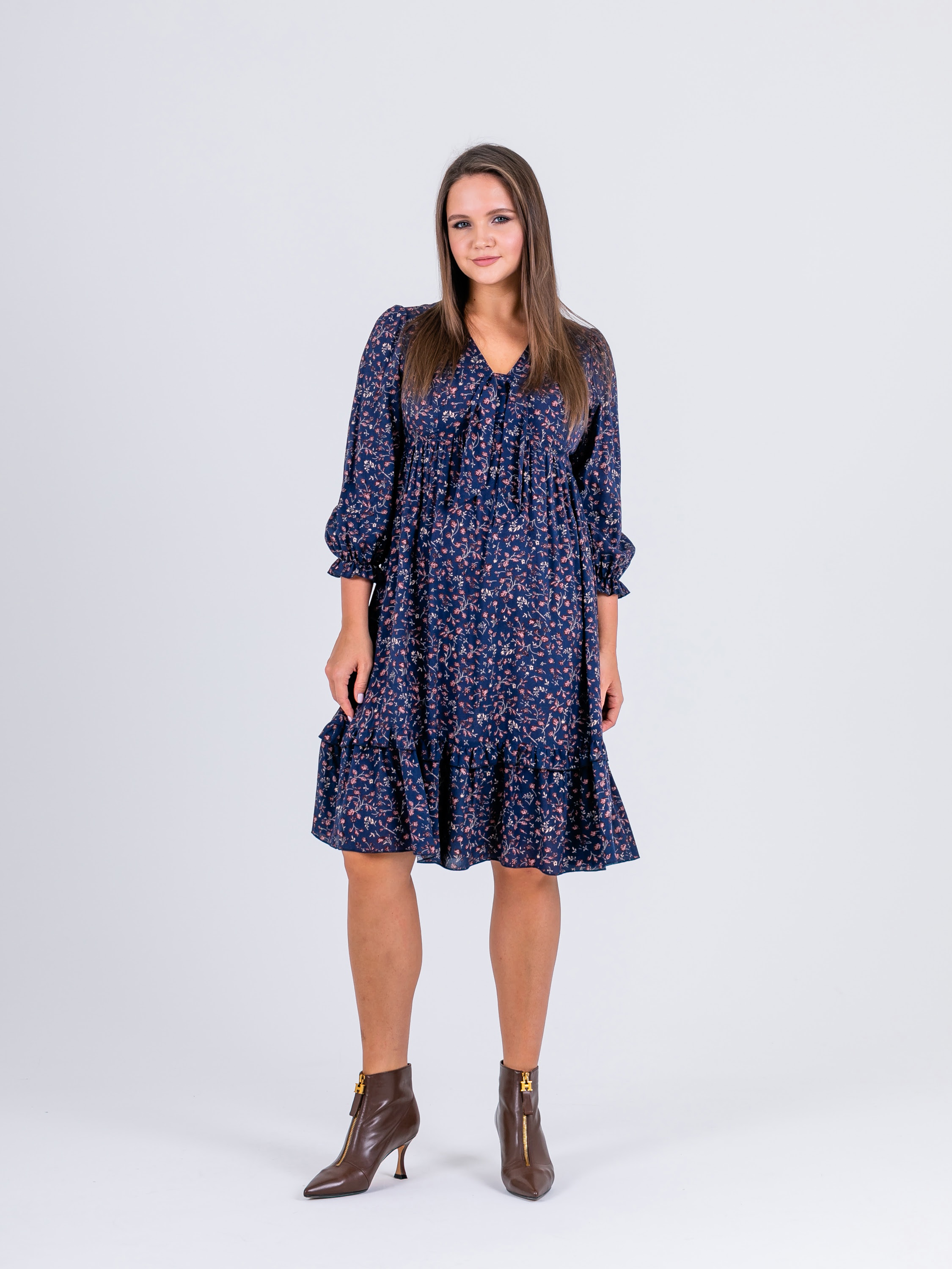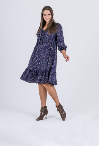На сайте указаны российские размеры. Крой: платье свободного силуэта из гладкой вискозы в стиле бохо. Отрезное под грудью, расклешенное, имеет втачной рукав, низ которого собран на эластичную тесьму, что позволяет фиксировать его на комфортную высоту и разный объем рук. Платье состоит из двух ярусов, которые выгодное подчеркивают достоинства фигуры и изысканно маскируют недостатки. Платье подойдет женщинам разных фигур и комплекций, а в особенности будущим мамам и прекрасным обладательницам шикарных форм. Отделка: имеет тонкие завязки в области груди, которые можно повязать в узел или изысканный бант. Ткань в мелкий цветок создает женственный и романтичный образ, который влюбляет в себя с первого взгляда. Сочетайте с однотонными жакетами и кардиганами из ассортимента Stern.