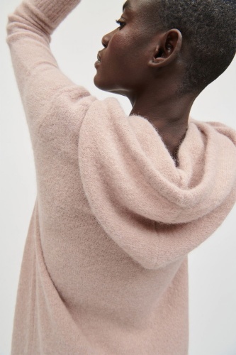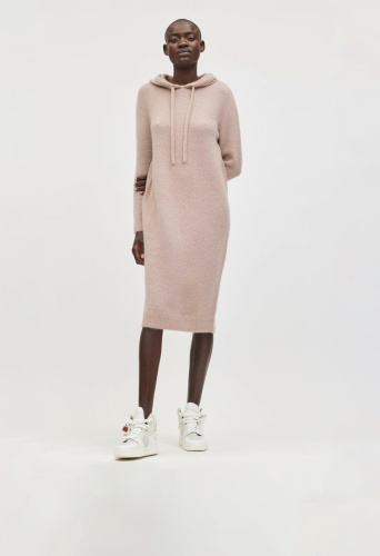 На сайте указаны российские размеры. Длинное платье прямого кроя из высококачественной итальянской смеси альпака с эластичной нитью и мелкими убавляющими деталями и деталями швов. Большой капюшон с кулиской сохраняет тепло и тепло. Рост модели 178 см.