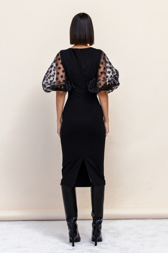 На сайте указаны российские размеры. Облегающее платье со вставками из органзы. Длина миди. Объемный рукав выше локтя из органзы. Застежка-молния. Рост модели 173 см.