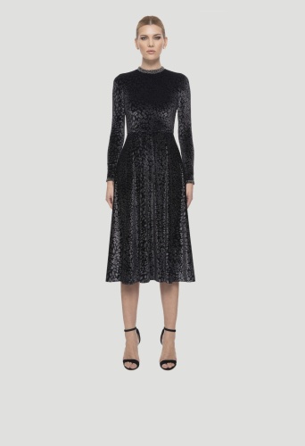 На сайте указаны российские размеры. Бархатное платье длины миди с животным принтом. Рост модели 174 см.