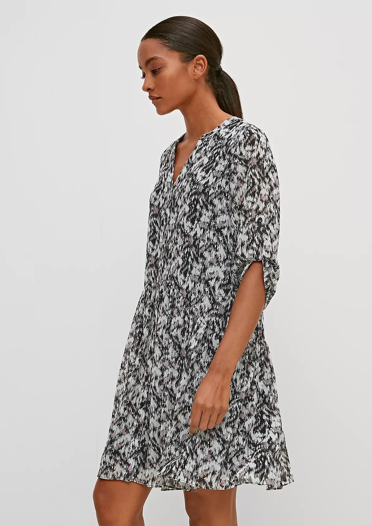 На сайте указаны российские размеры. Шифоное платье с непрозрачной подкладкой. Треугольный вырез горловины, рукава фиксируются. Длина спинки в 42 размере - 94 см.