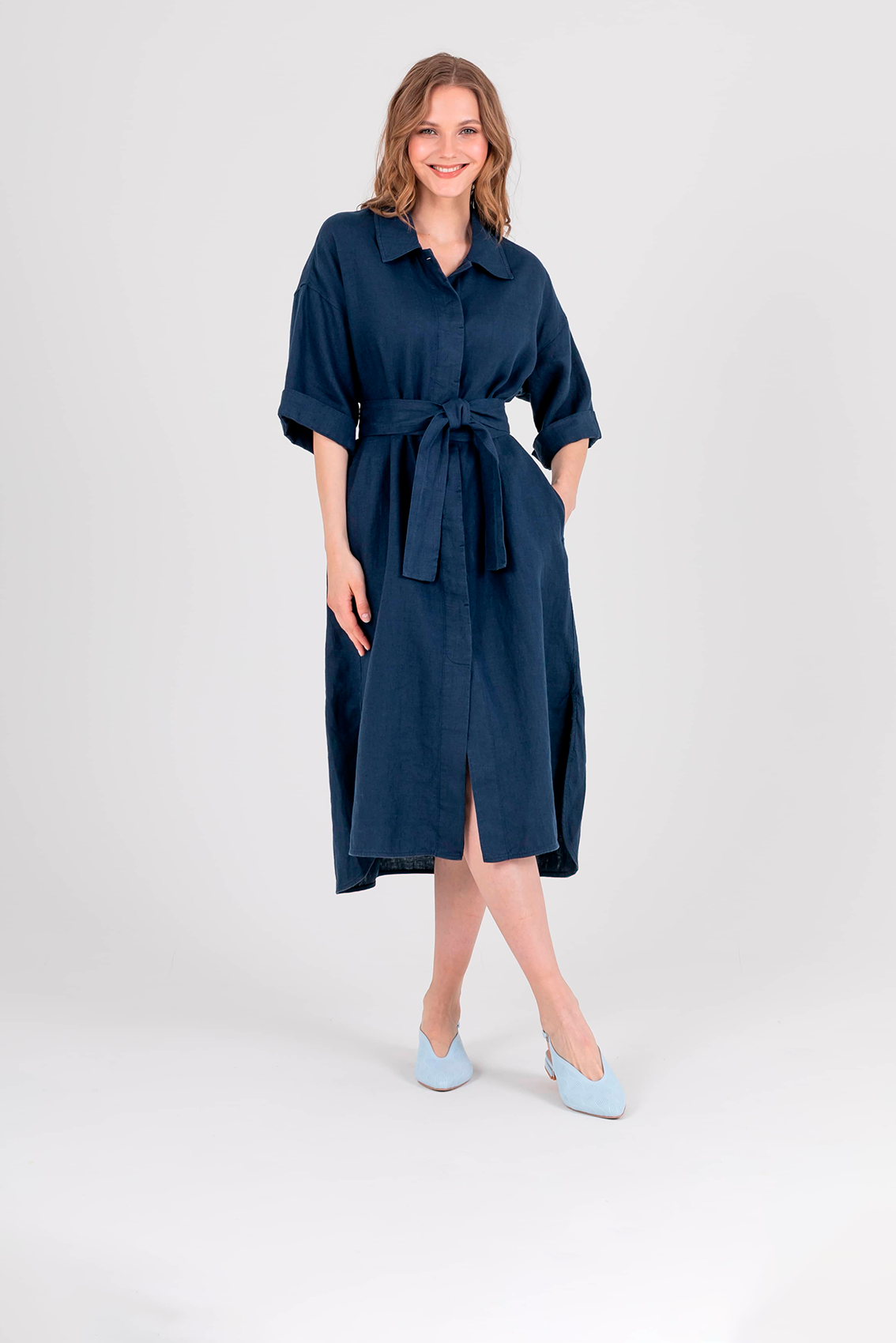Платье-рубашка прямого силуэта длиной midi из натурального льна с потайной застежкой на 10 прорезных петель и пуговиц, с разрезами в боковых швах и съемным поясом. На спинке прямая кокетка. Укороченные цельнокроеные рукава со спущенной линией плеча. Стояче-отложной воротник.