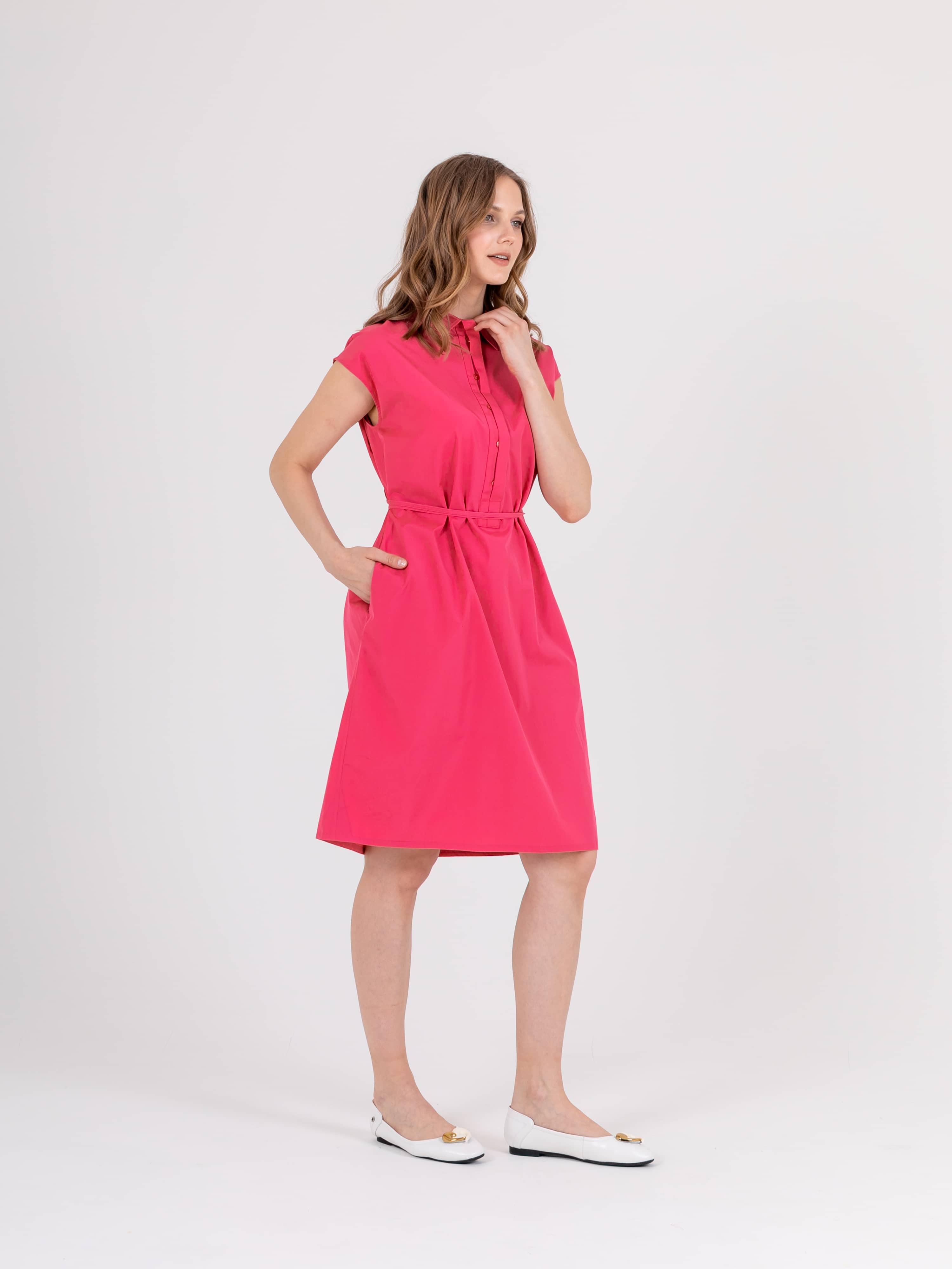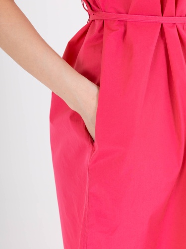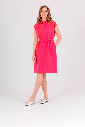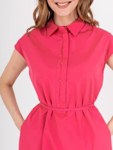 Яркое платье полуприлегающего силуэта длиной выше колен из легкого 100% хлопка со съемным поясом и карманами в боковых швах. На спинке прямая кокетка и двойные шлевки для более плотного прилегания. Короткие цельнокроеные рукава. Стояче-отложной воротник с декоративной планкой на 6 прорезных петель и пуговиц.