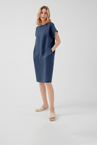 Платье-кокон с горловиной лодочкой, складкой на спине и планкой с имитацией пуговиц. Платье длиной до колена из льняной ткани в темно-синем цвете.