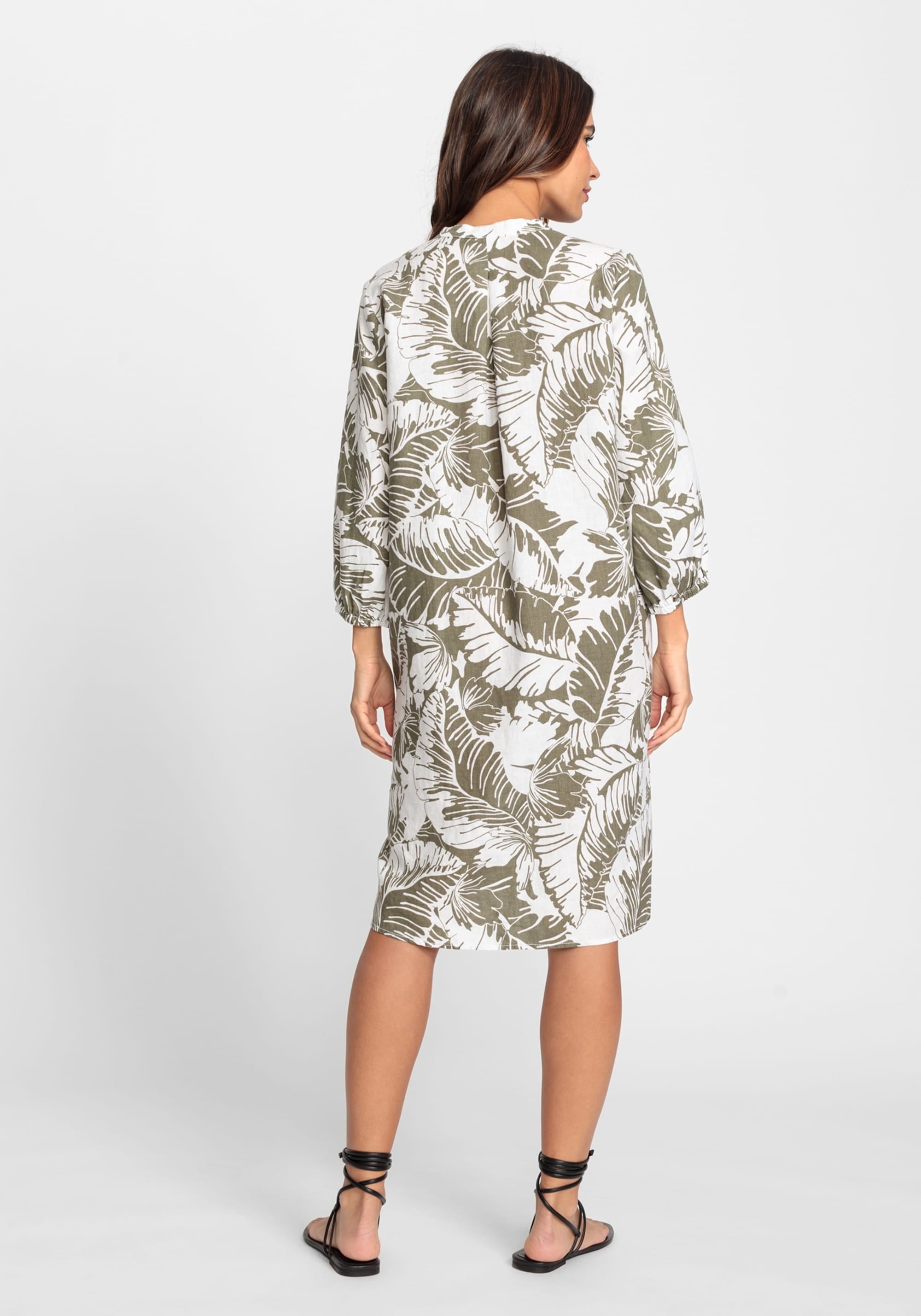Платье с тропическим садовым принтом. Застежка на пуговицах позволяет носить его закрытым как платье или расстегнутым как удлиненный плащ или пляжную накидку. Закругленная кромка и потайные боковые карманы изготовлены из 100 % льна, обеспечивающего воздухопроницаемость и комфорт.