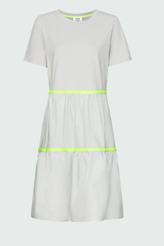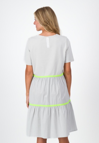 Современное платье миди с круглой горловиной и короткими рукавами. Эластичный трикотаж в верхней части тела обеспечивает комфорт, особенно красиво ложатся воланы из хлопкового материала. Ленты контрастного цвета на отдельных уровнях подзора придают изюминку. Прорезные карманы и повседневный принт на шее искусно завершают образ.