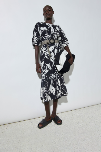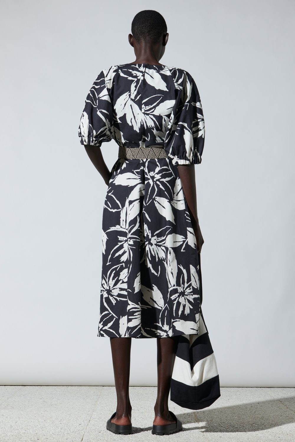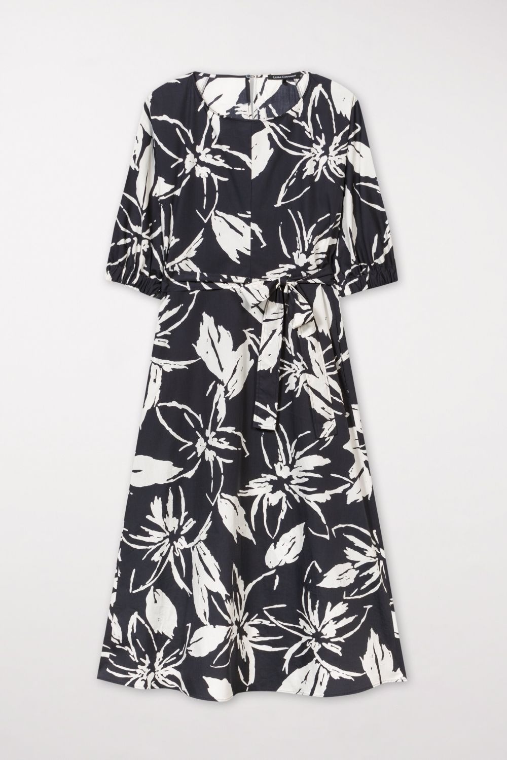 Платье средней длины из хлопкового поплина с эксклюзивным рисунком в виде цветов гибискуса и двумя карманами. Слегка расклешенный фасон юбки подчеркивается завязывающимся на талии поясом. Рукава-крылышки имеют более широкий дизайн и отделаны эластичной окантовкой.