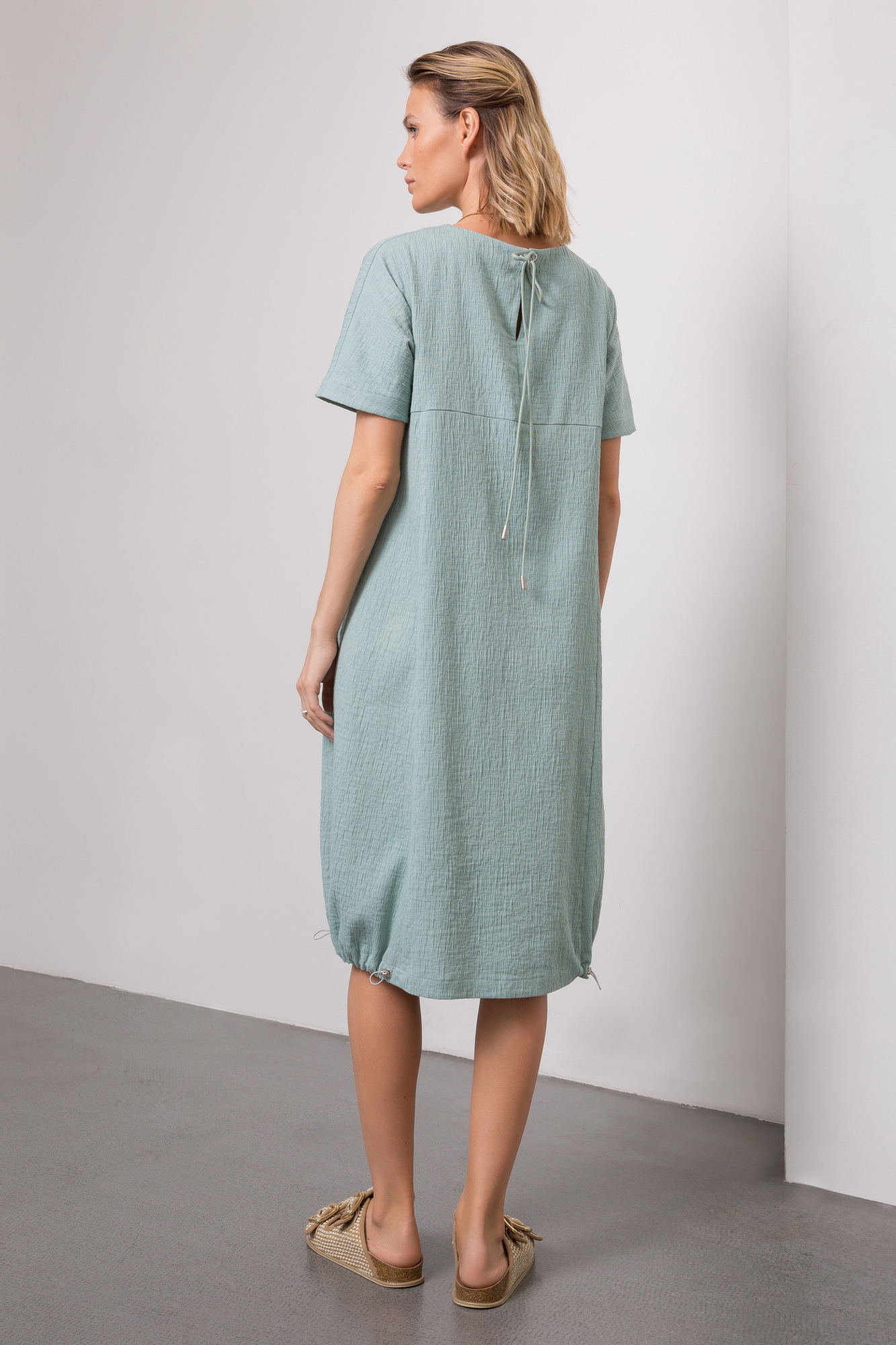 На сайте указаны российские размеры. Лаконичное и комфортное платье свободного О-образного силуэта. Выполнено из смесового хлопка с неординарной «мятой» фактурой. По низу регулируется кулиской. В рельефах бочков удобные карманы. На спинке застежка – свободно завязывающийся шнурок.