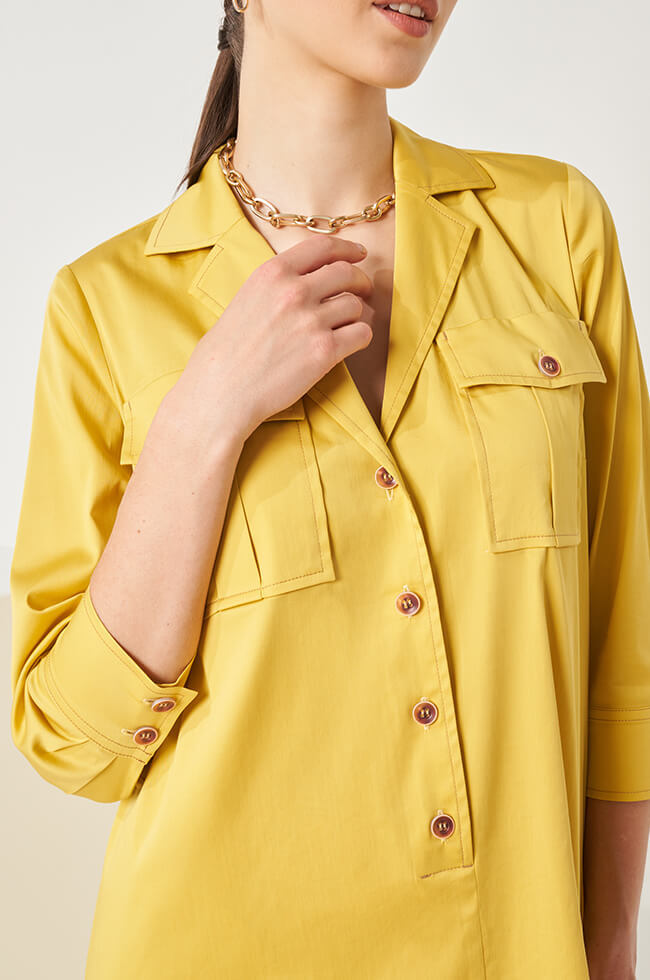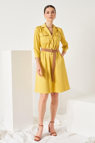 Платье-рубашка свободного силуэта с V-образным вырезом горловины с отложным воротником и лацканами. Центральная застежка на контрастные пуговицы. Рукава ¾, сосборены на манжету с разрезом и застежкой на контрастные пуговицы. Спереди нагрудные накладные карманы с клапанами. В боковых швах выполнены потайные карманы. Спинка с кокеткой. Дополняется контрастным поясом-лентой с прямоугольными пряжками.