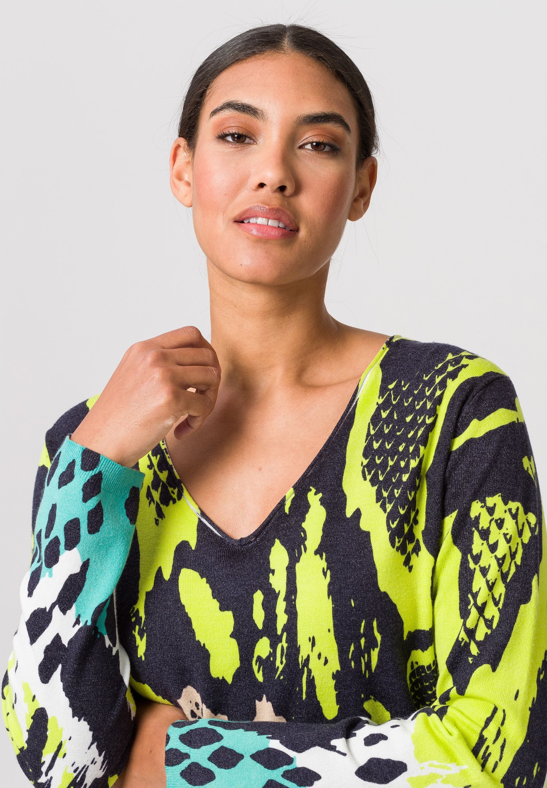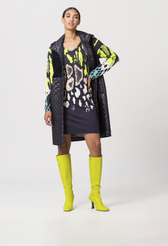 Трикотажное платье для женщин с широким V-образным вырезом и закатанным подолом. Мягкий и уютный тонкий трикотаж украшен таким выразительным и сочетающимся по цвету животным принтом. Кроме того, широкий V-образный вырез подчеркивает женственное декольте.
