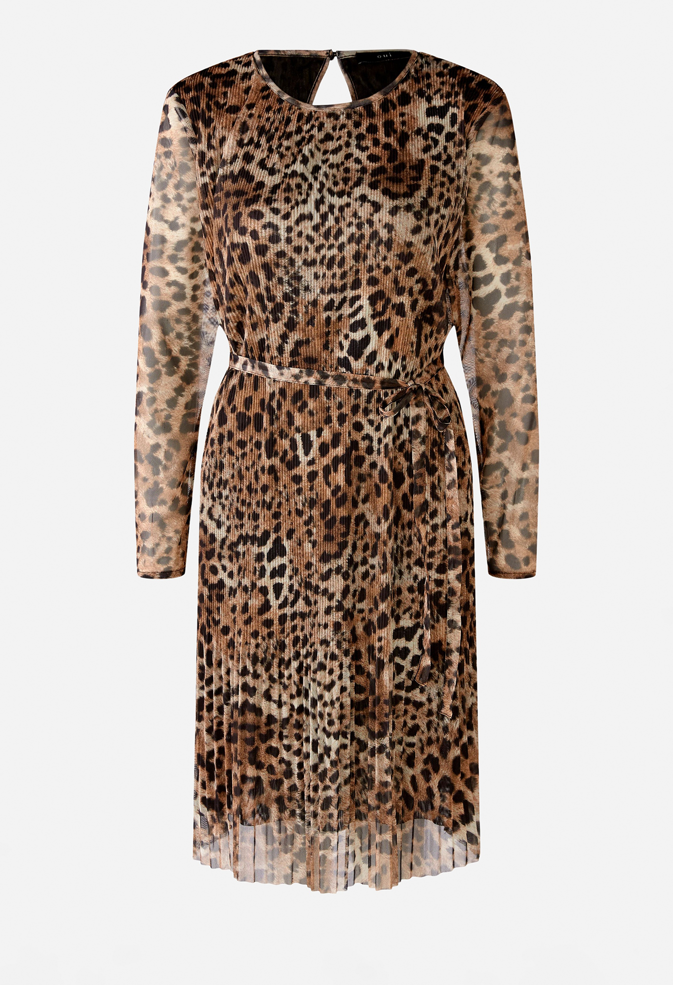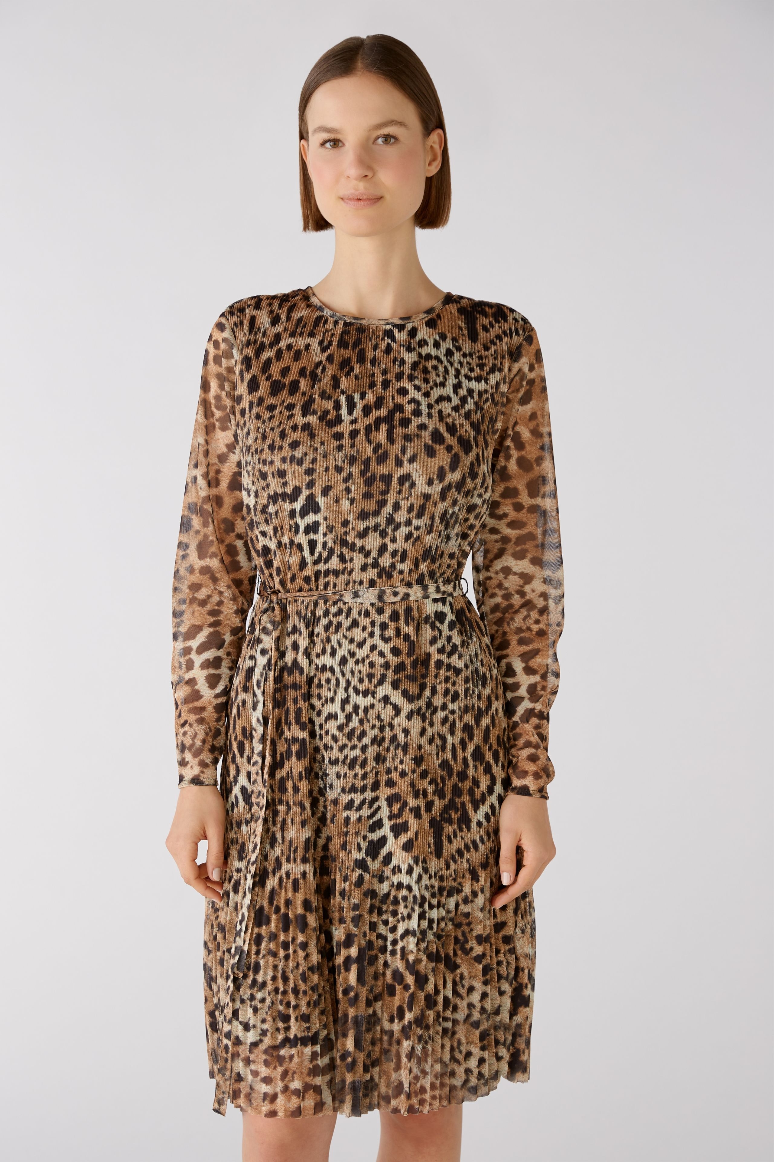Платье длиной до колена с подчеркивающими фигуру сетчатыми складками. Плиссированная сетчатая ткань с натуралистичным леопардовым узором по всей поверхности. Длина до колена, прямой крой, свободная ширина юбки благодаря более широким складкам. Закрывается на небольшую кнопку сзади. Тело на подкладке, рукава без подкладки. Можно носить с поясом или расстегнуть как свободное платье. Длина для размера 42: 100 см.