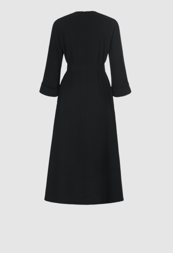 Платье миди из техно-атласа будет стильно и элегантно сопровождать свою обладательницу в течение всего дня. Небольшие акценты, такие как слегка раструбные рукава длиной три четверти, тканевый пояс с красивым металлическим элементом и струящаяся юбка, расставляют акценты.
