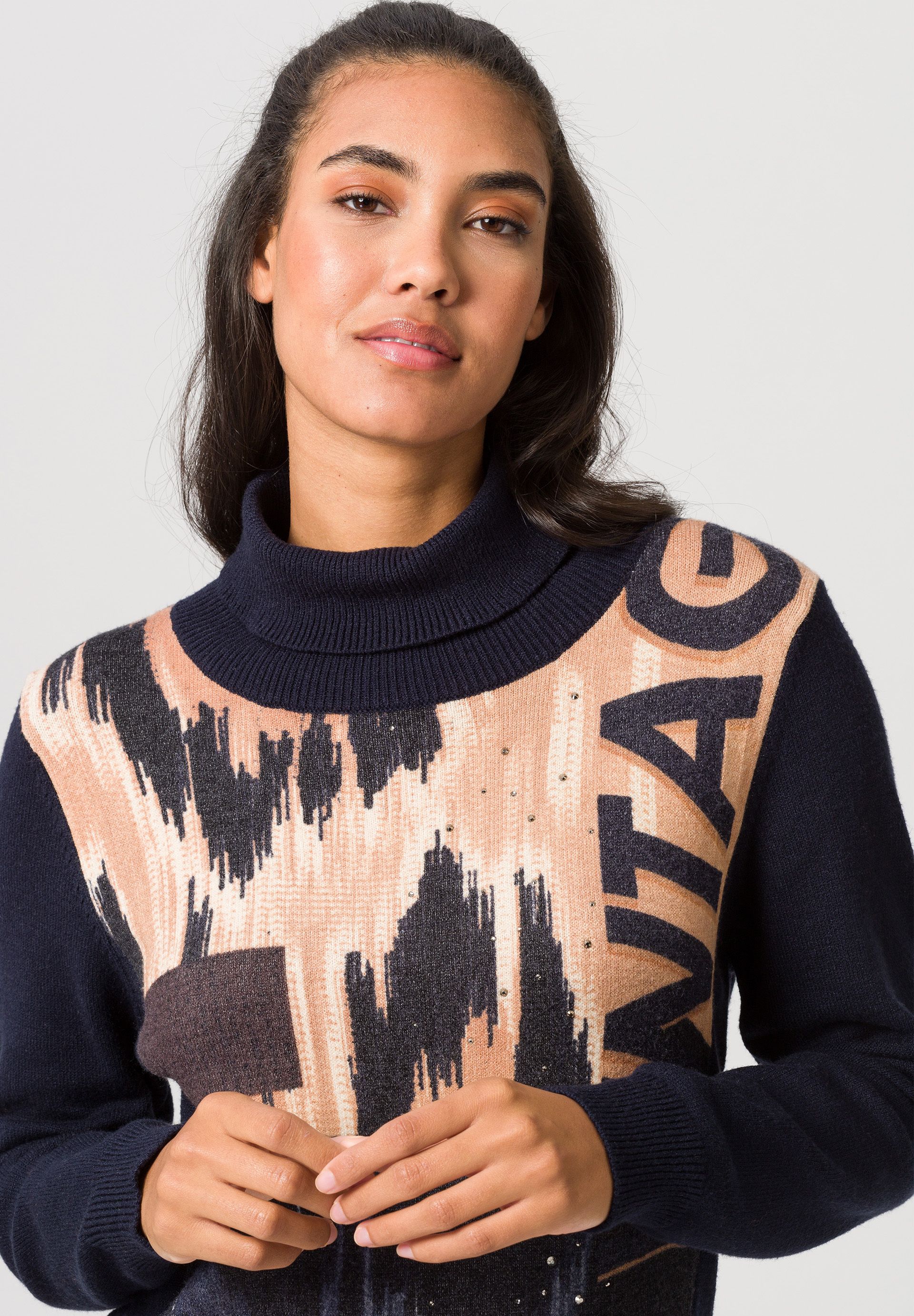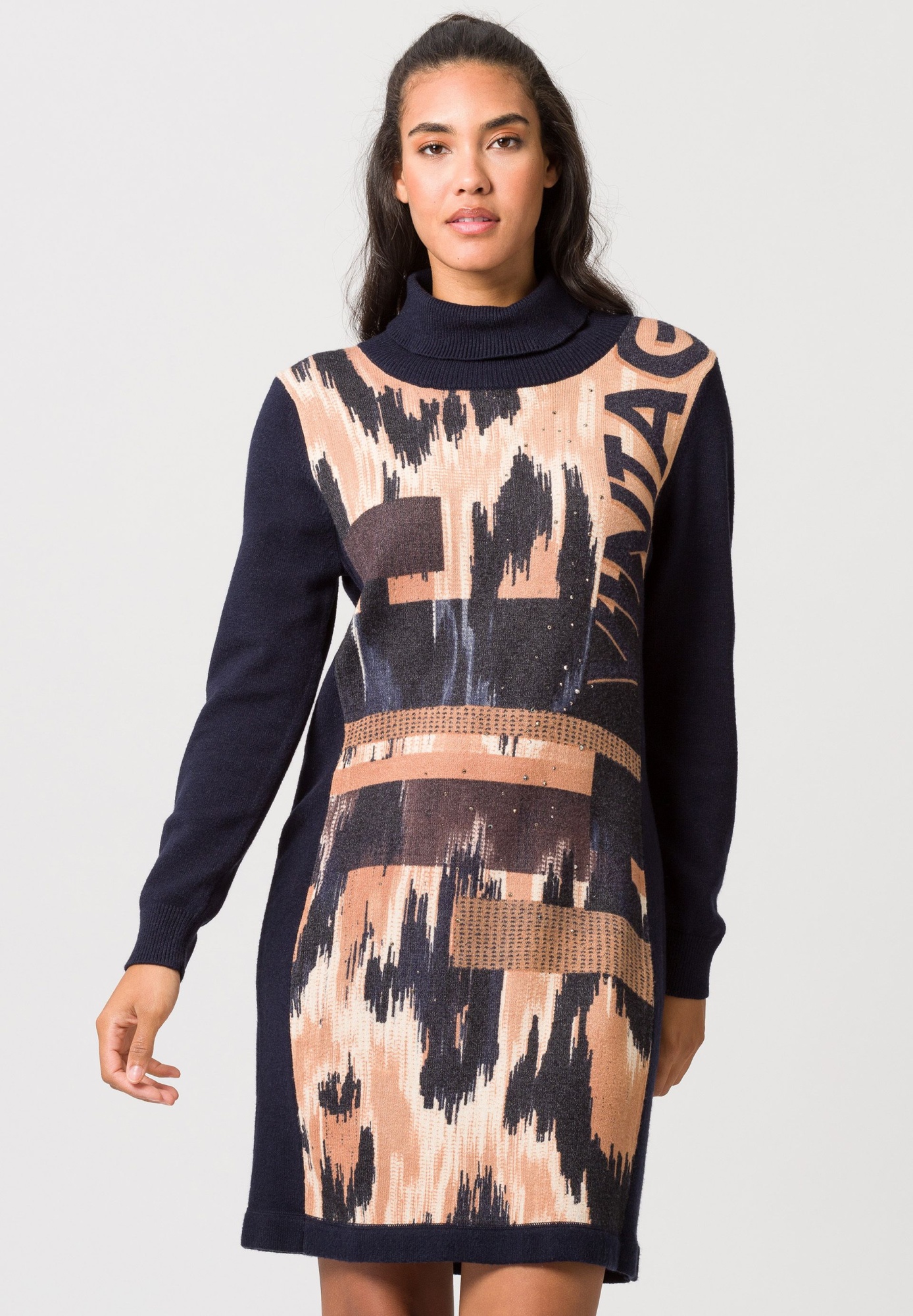 Вязаное платье женское с ребристыми манжетами на рукавах. Мягкая, тонкая трикотажная ткань с содержанием вискозы делает ее чрезвычайно приятной на коже, а облегающий крой делает ее очень комфортной. Водолазка в рубчик также согревает шею. Что особенно привлекает внимание, так это дизайн передней части с ярким узором по всей поверхности и сверкающими заклепками.