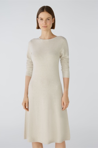 Трикотажное платье бесшовной вязки. Приталенный топ, слегка расклешенная юбка, длина до колена. Круглый вырез. Удлиненный рукав. Узкие ребристые манжеты на воротнике, рукавах и подоле. Длина для размера 42 - 106 см.