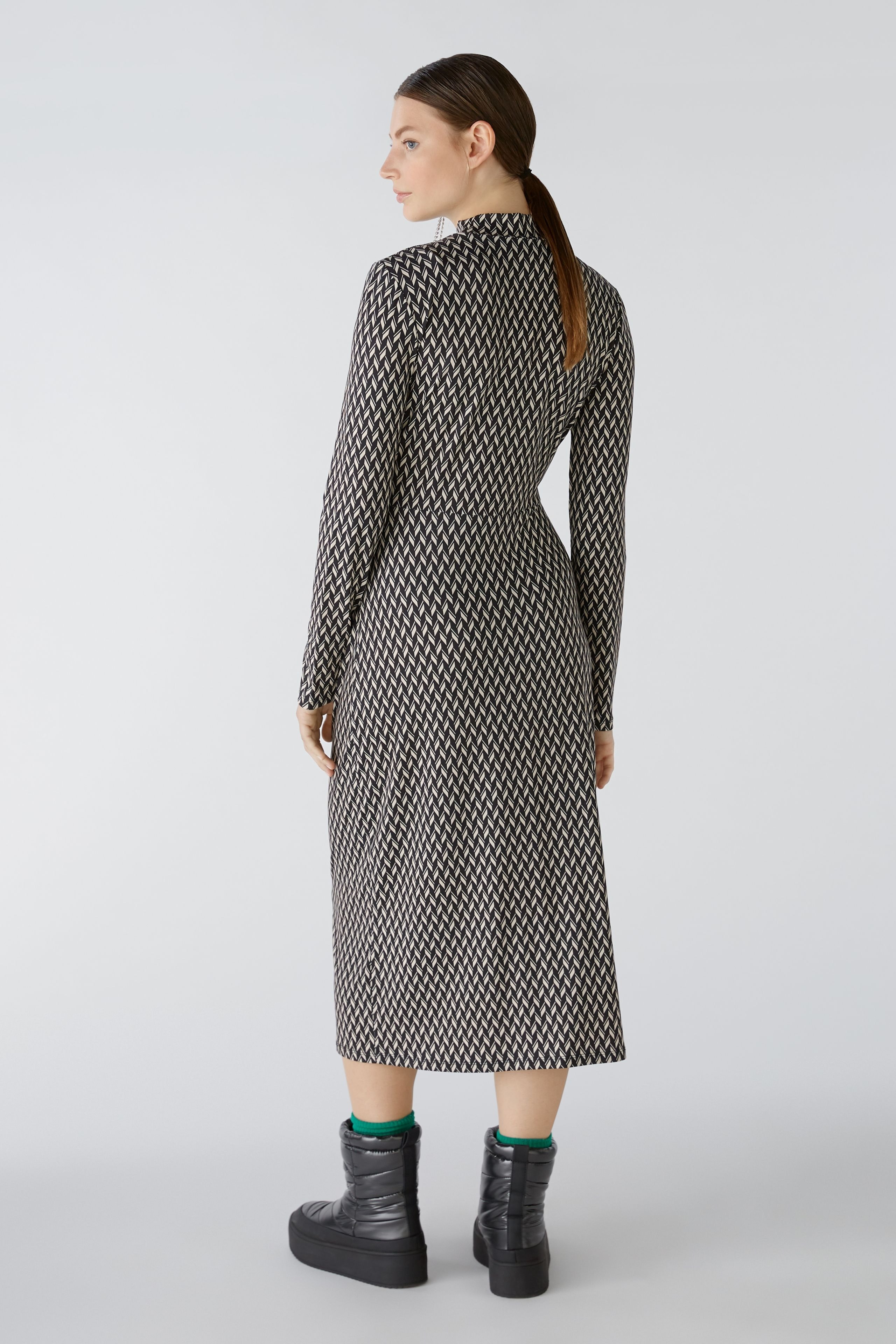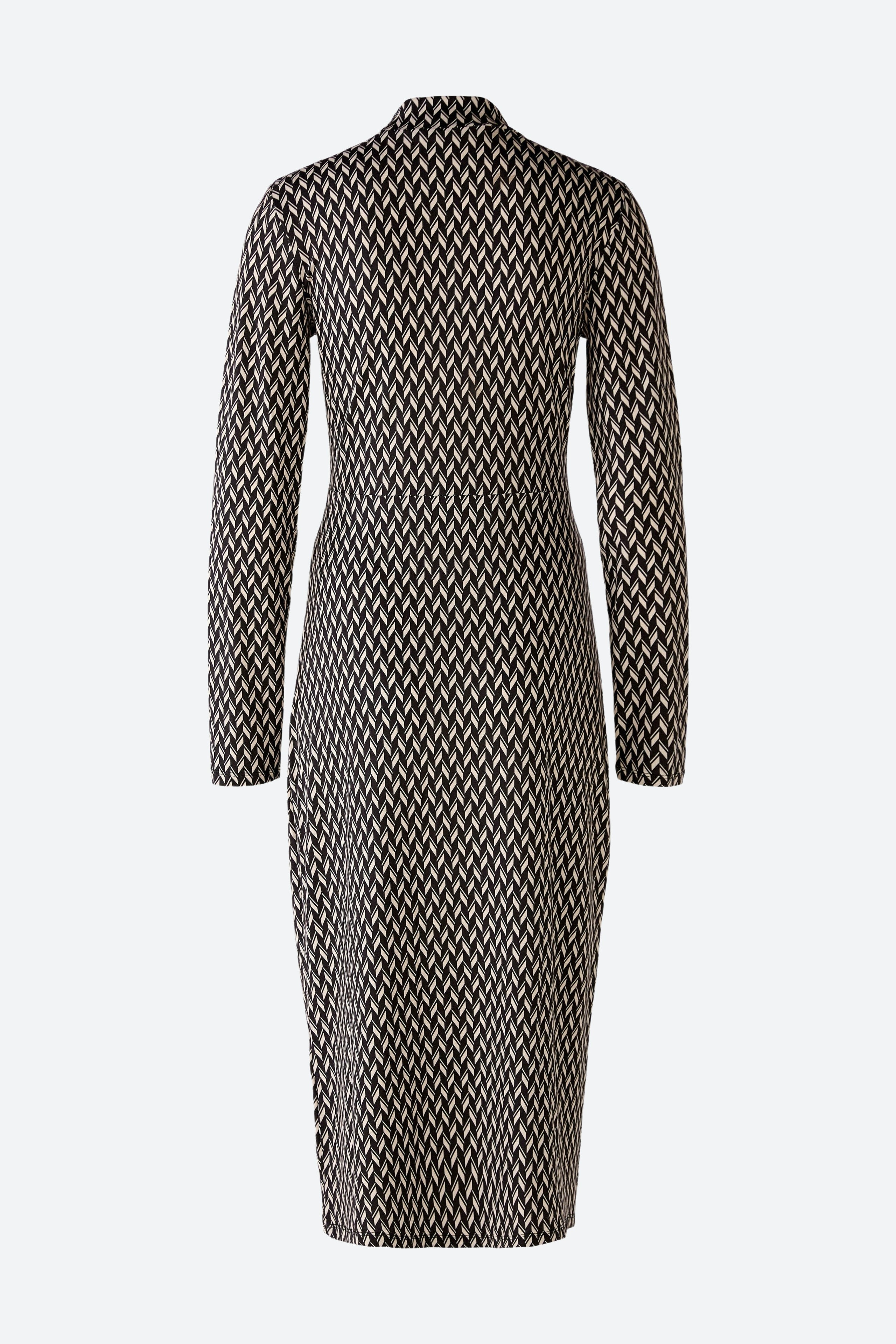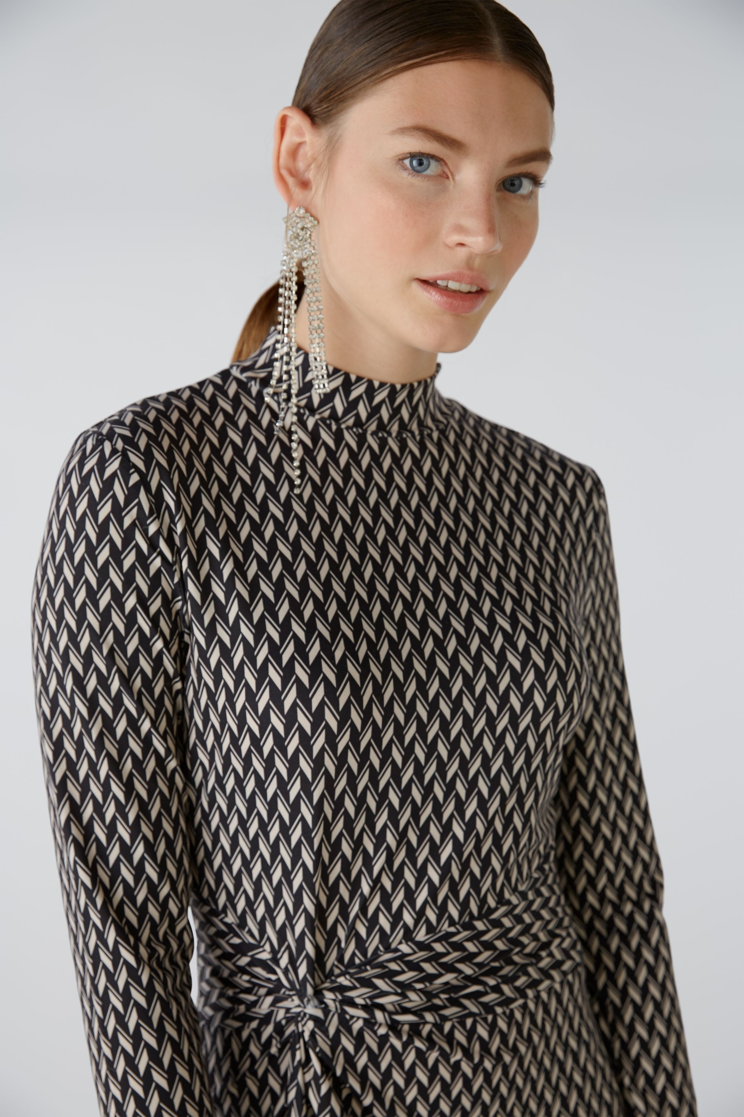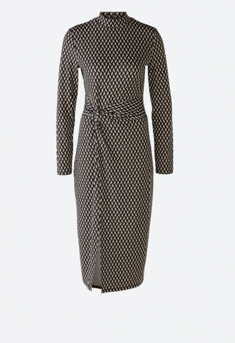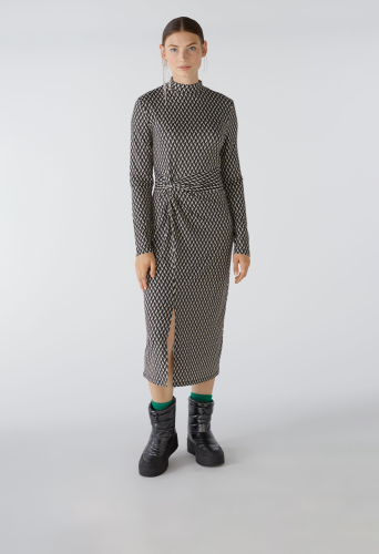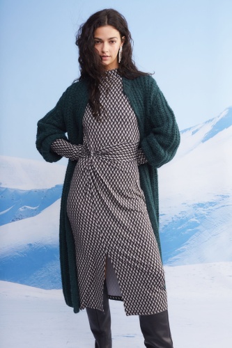 Облегающее платье миди с узлом на талии. Высокоэластичный, струящийся материал Silky Touch из переработанного сырья, с принтом по всей поверхности. Приталенный крой, длина миди, скрывающий узел на талии. Узкий воротник-стойка, облегающий шею. Без застежки. Разрез чуть выше колена для большей свободы движений. Длина для размера 42 - 116 см.