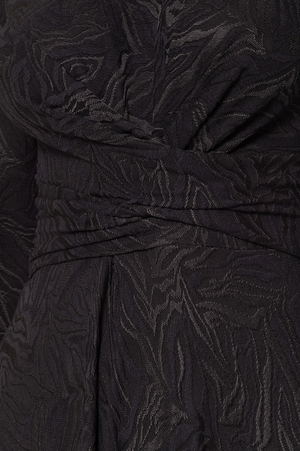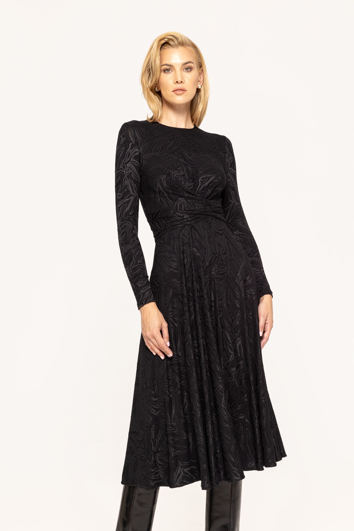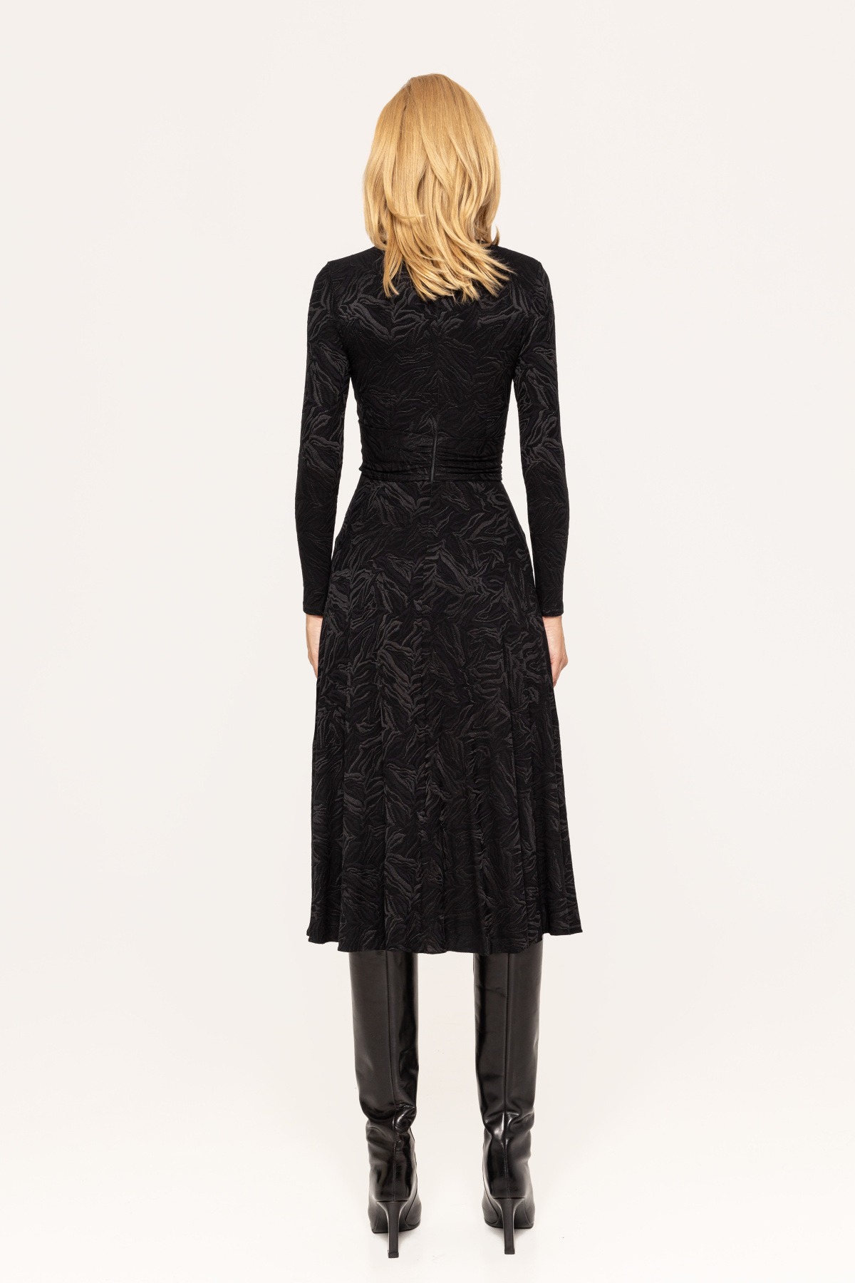 Платье миди жаккардовой вязки с длинными рукавами. Воротник у основания шеи. Облегающий дизайн.