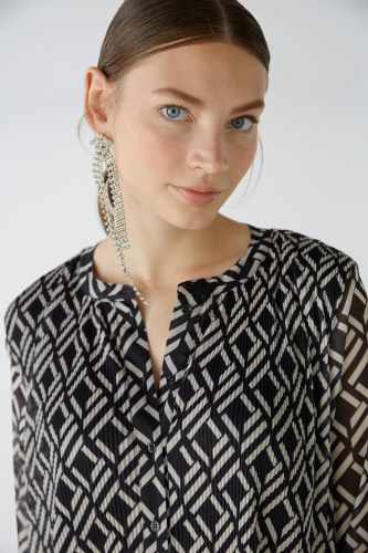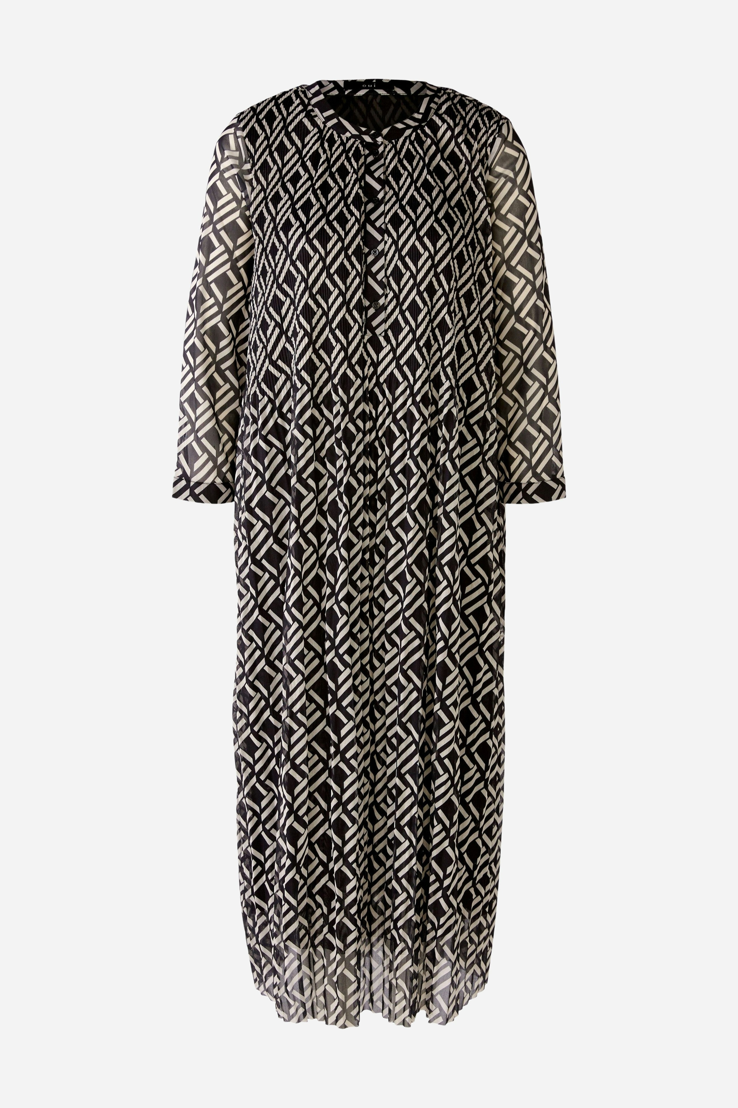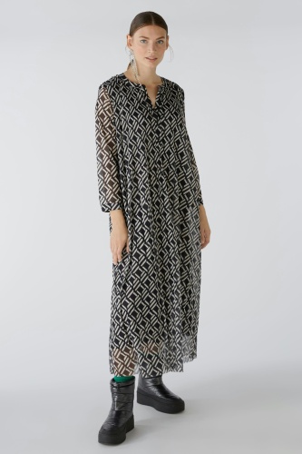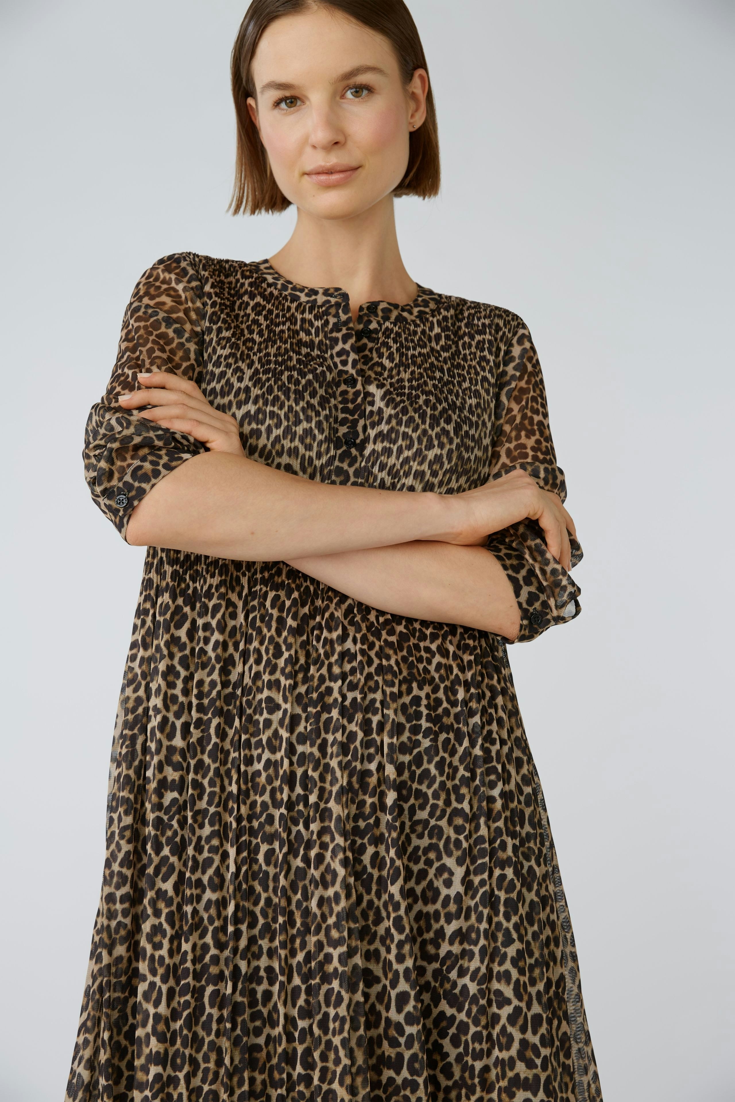 Струящееся платье из сетки со складками и принтом по всей поверхности. Свободный крой, длина миди. Круглая горловина с длинной планкой на пуговицах, легко надевается. Рукава длиной 3/4 с манжетами и маленькой пуговицей. Плотно прилегающие складки на верхней части тела, свободные и струящиеся в области юбки. Длина для размера 42: 126 см.
