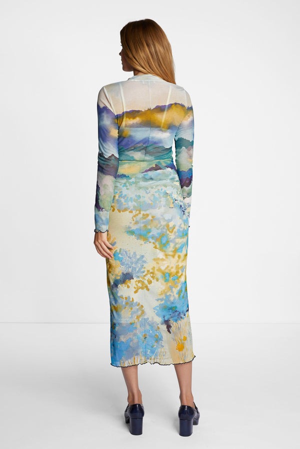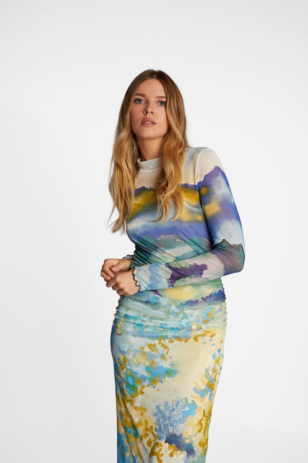 Облегающее фигуру платье украшено прозрачным, размытым пейзажным принтом. Оно изготовлено из переработанной сетки с внутренней подкладкой и необработанным краем. Оборки по бокам создают строгий силуэт. Длина для размера 42: 131 см. Окружность груди для размера 42: 64 см.