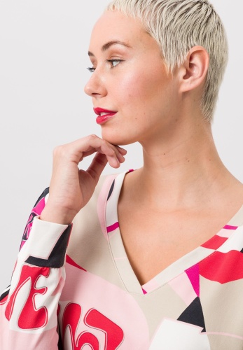 Платье женское с принтом по всей поверхности и контрастными полосками. Контрастные полосы вдоль рукавов дополняют привлекательный принт и в то же время придают платью слегка спортивный вид. Эластичная хлопчатобумажная ткань также оказывает динамичный эффект, обеспечивая идеальную посадку и свободу движений. Помимо изысканного принта и полосок, подол платья имеет женственный вид с запахом.